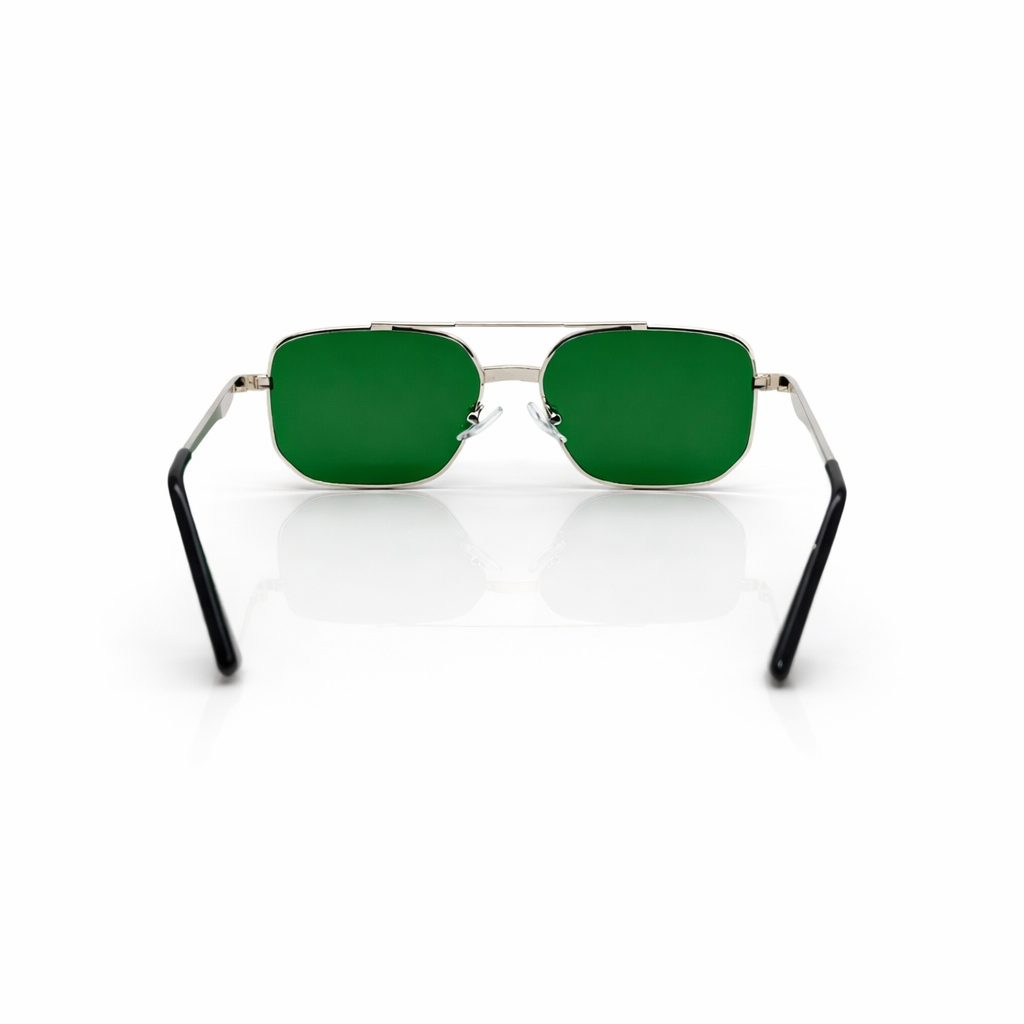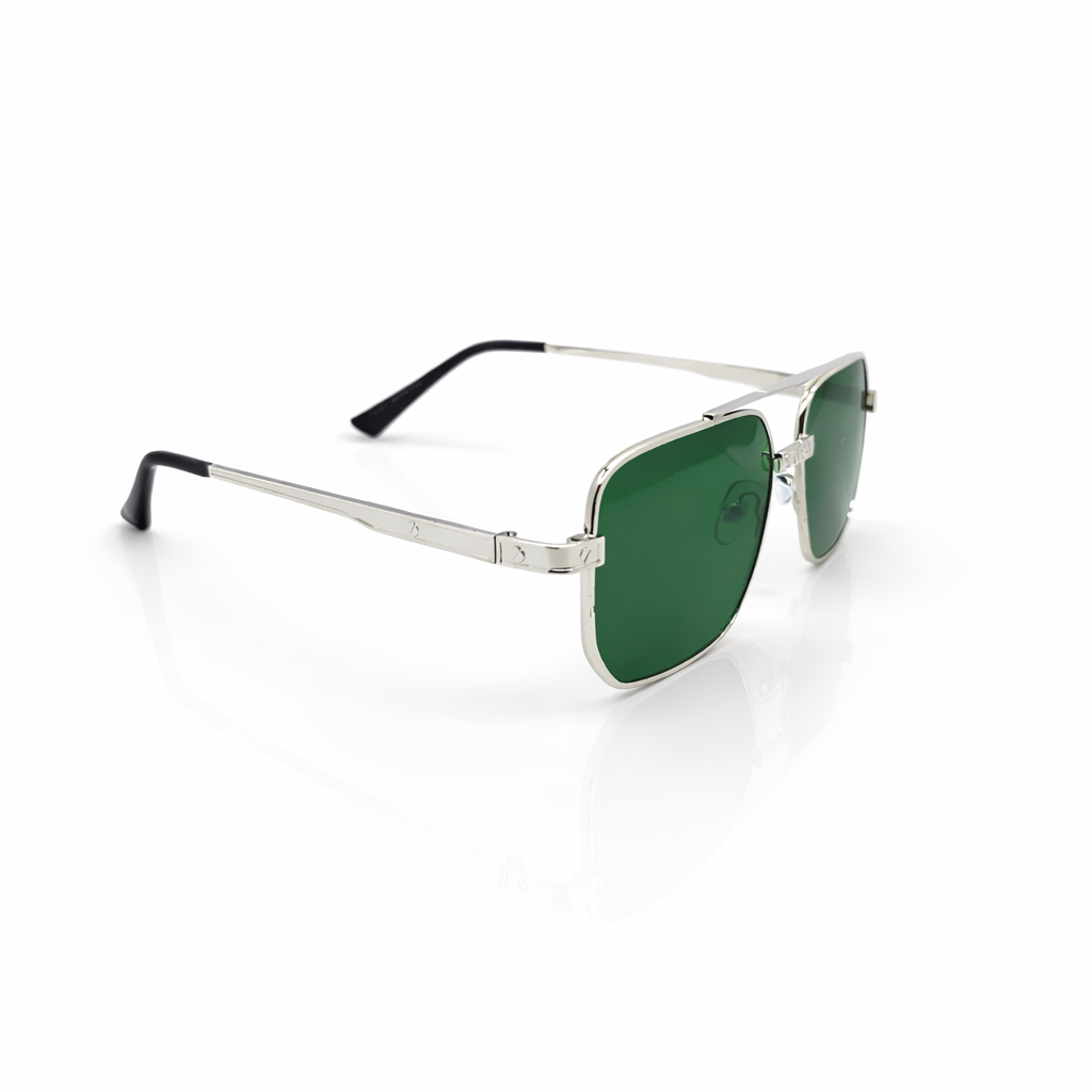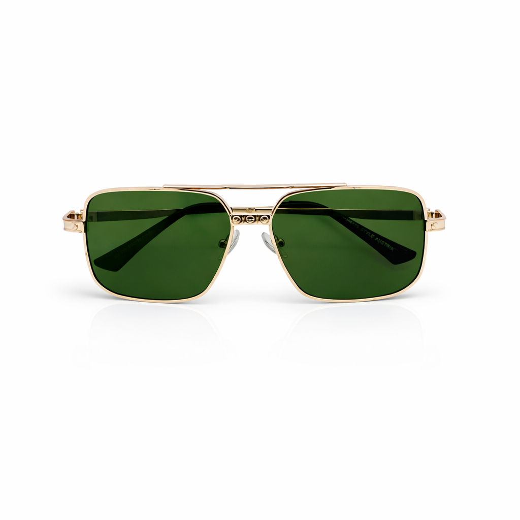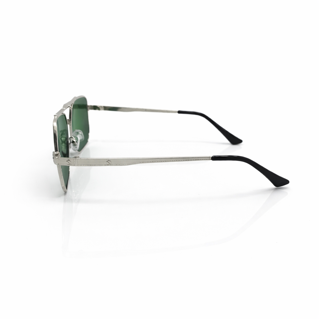 The design is characterized by its geometric, squared-off lenses and a prominent double bridge that adds structural flair. A standout feature of this model is the decorative screw-head motifs located on the bridge and the temples, giving the eyewear a sophisticated, "prestige" look often found in high-end fashion.