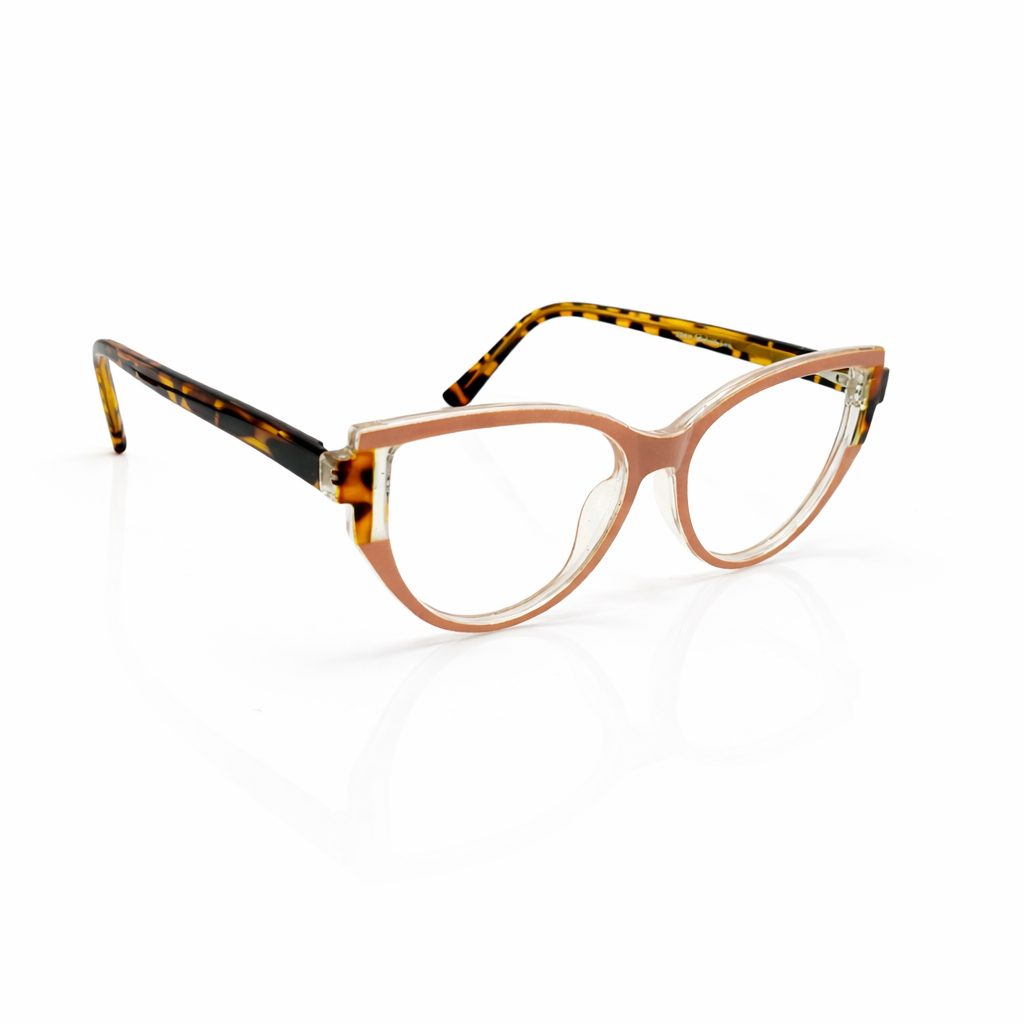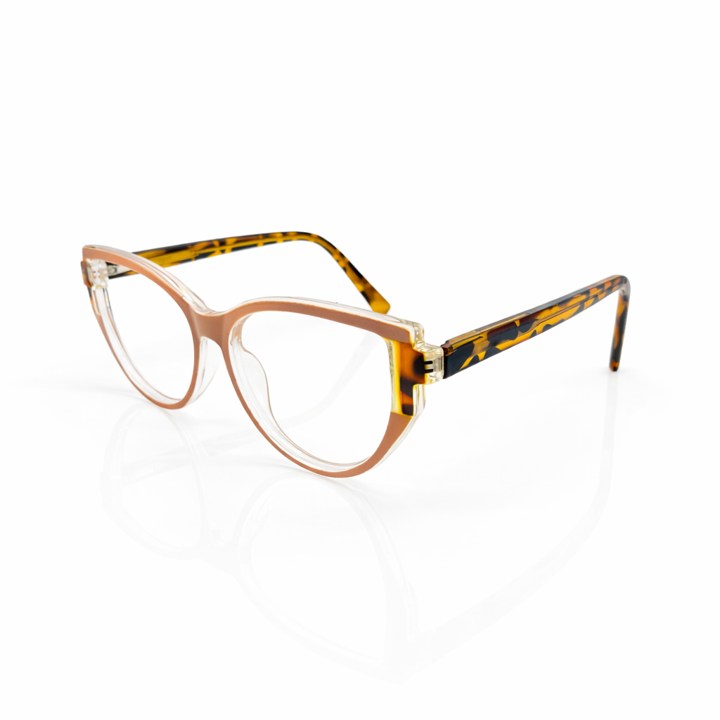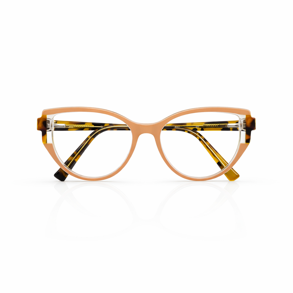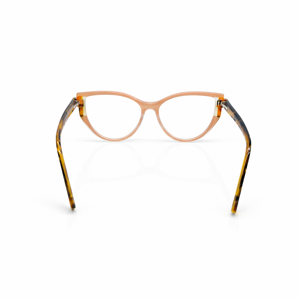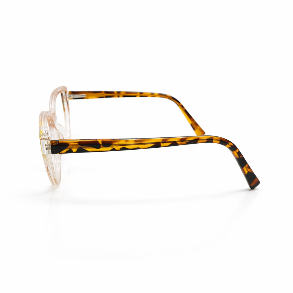 The design features a timeless soft rectangular silhouette, versatile enough to transition seamlessly from work to weekend. The frame is crafted from premium translucent crystal acetate in a luscious honey-cocoa hue. This warm, semi-transparent finish adds a natural glow to the complexion, softening facial features while maintaining a defined look.