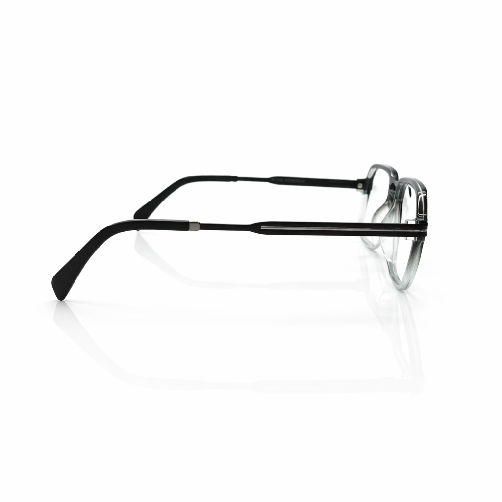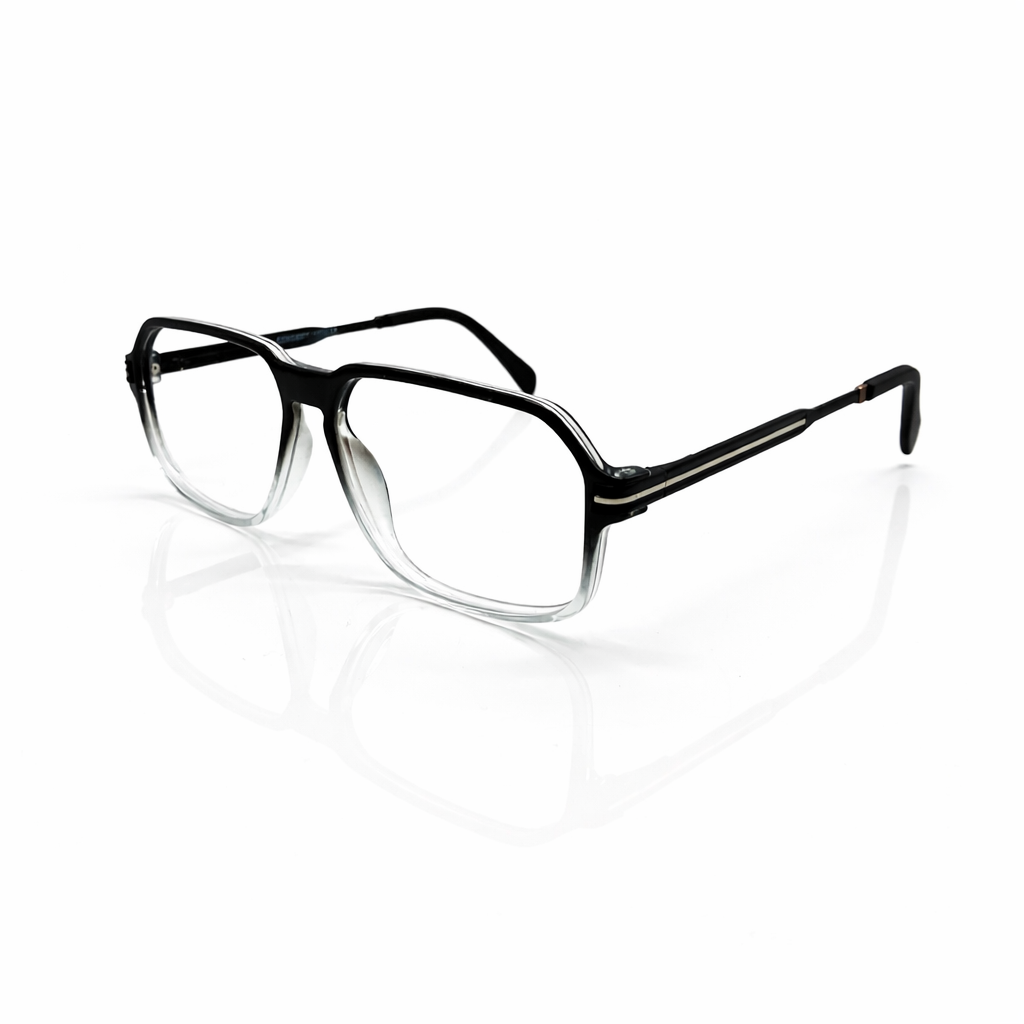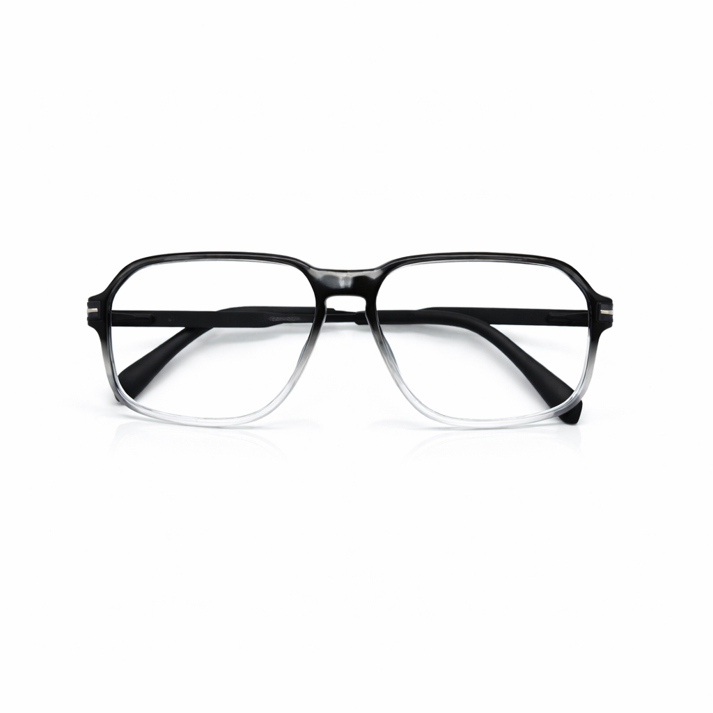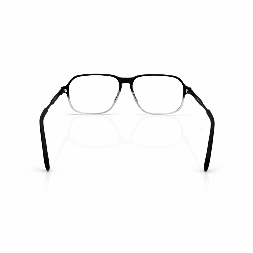 The silhouette is a confident soft geometric square, featuring a strong brow line that seamlessly curves into rounded corners for a flattering, modern profile. The defining feature is the striking two-tone gradient (ombre) finish: the frame begins in a deep, opaque Charcoal Black at the top and fades effortlessly into a Crystal Clear bottom. This "fade" effect visually lightens the frame on the face, emphasizing the brow while keeping the under-eye area open and bright.