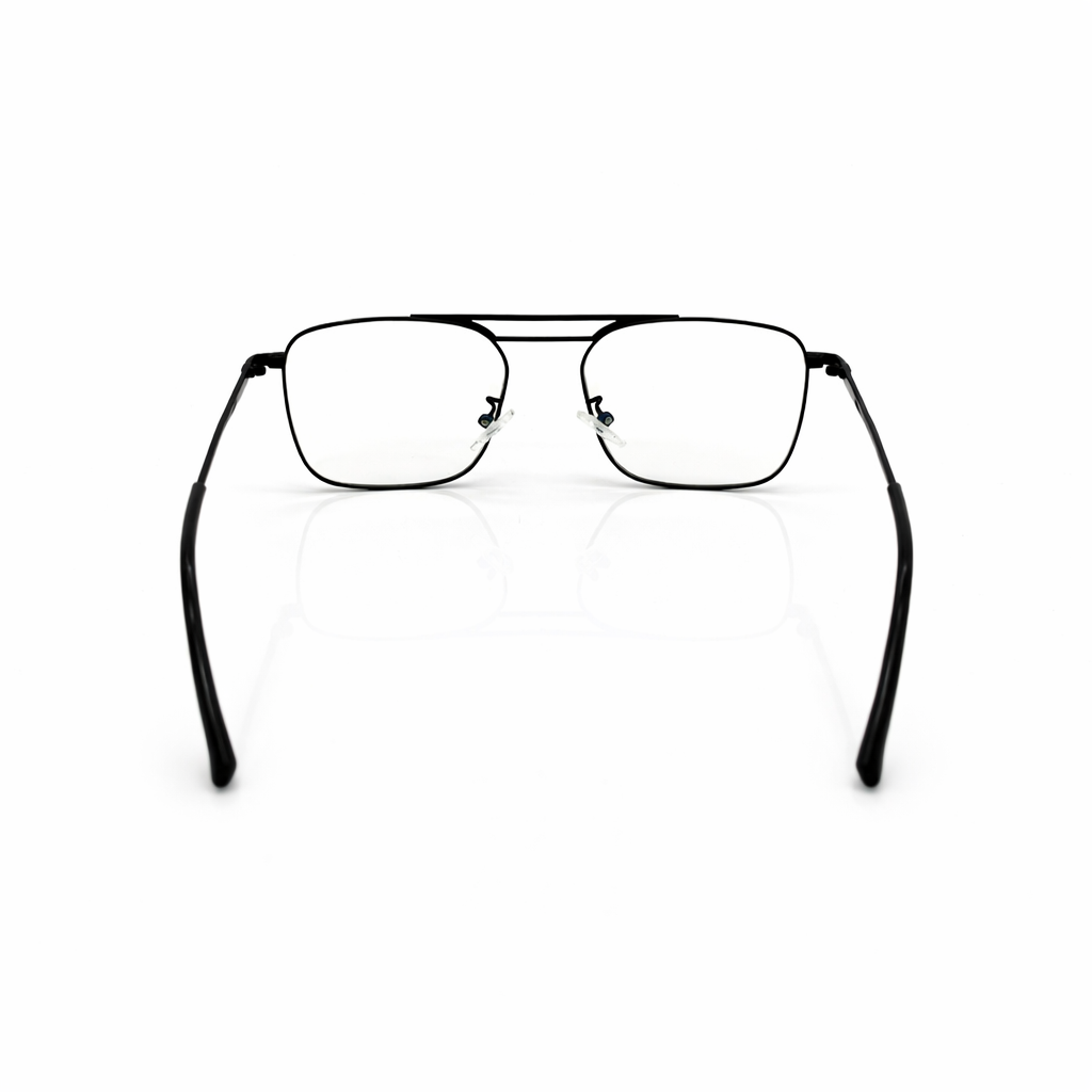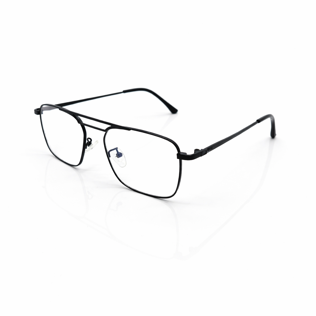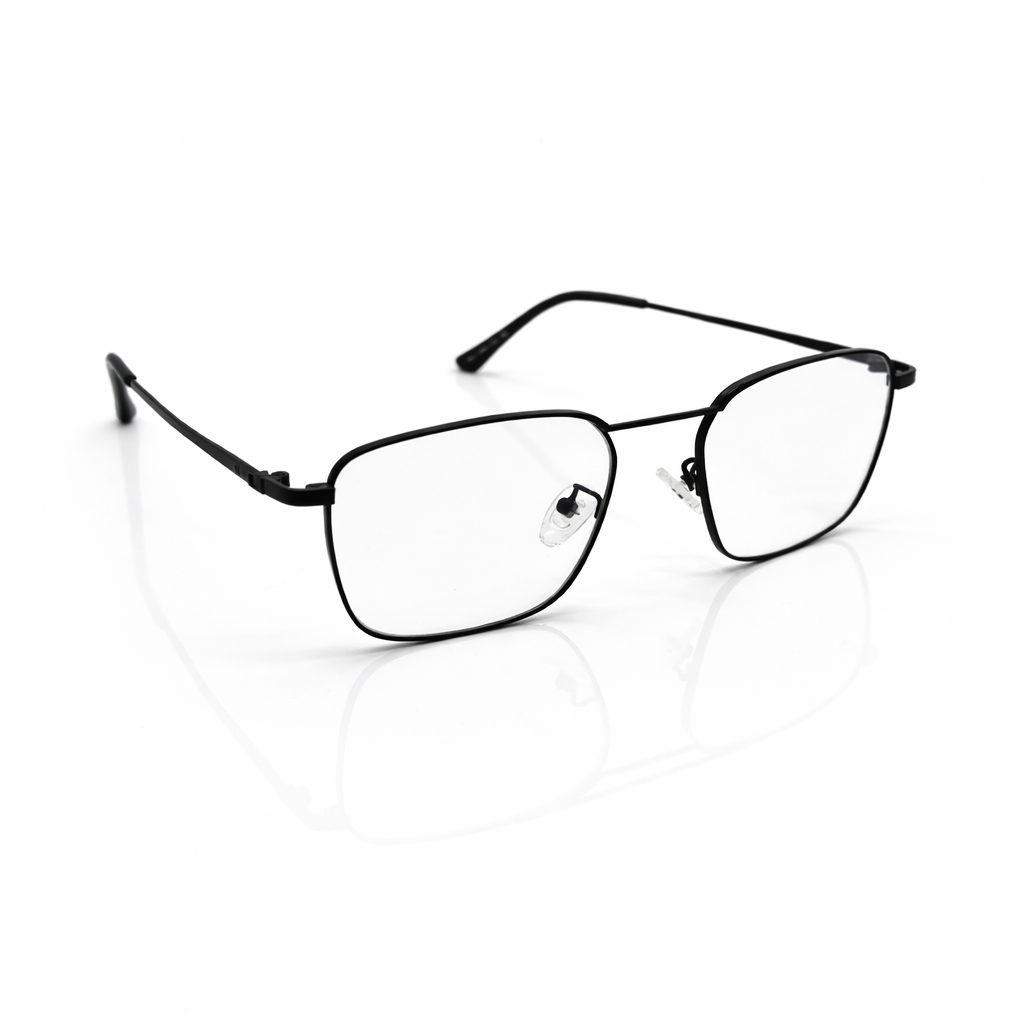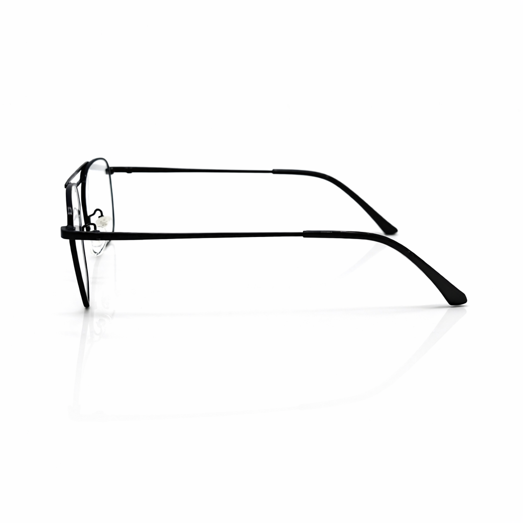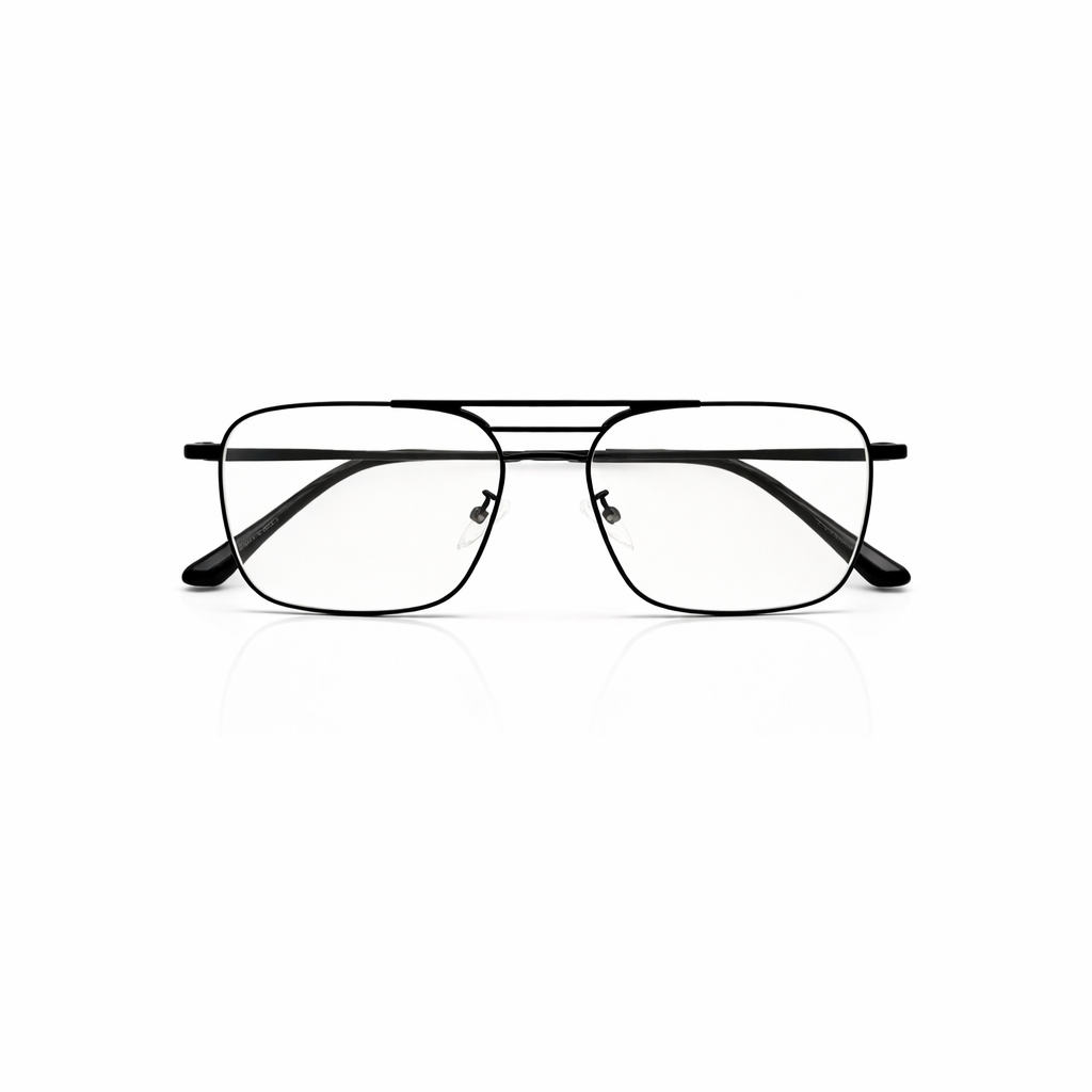 A modern rectangular navigator shape with subtle geometric softening at the corners. Features a distinctive flat-top double bridge, adding structural integrity and a nod to classic aviator heritage. Constructed from ultra-thin matte black metal, offering a lightweight feel with a sophisticated, non-reflective aesthetic.