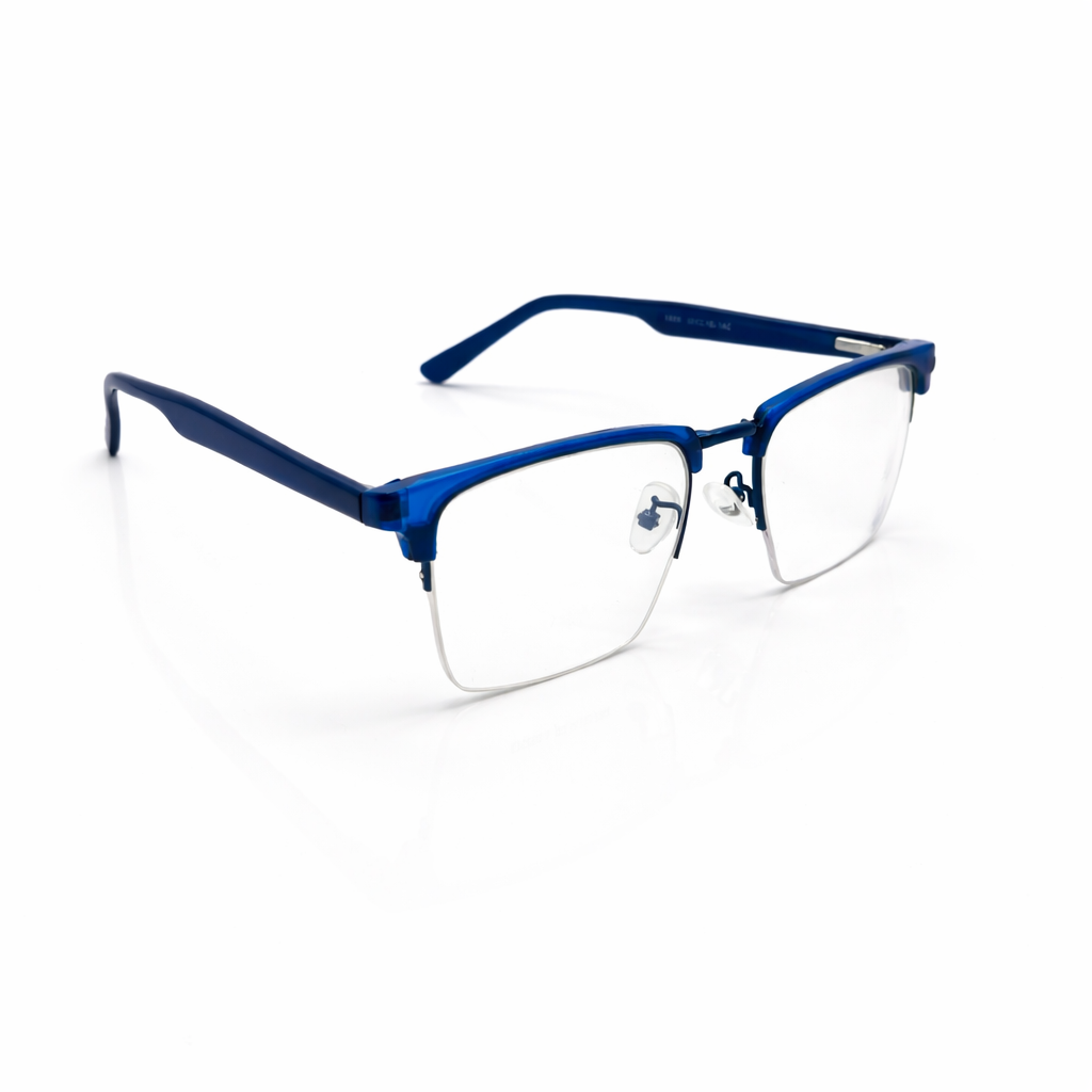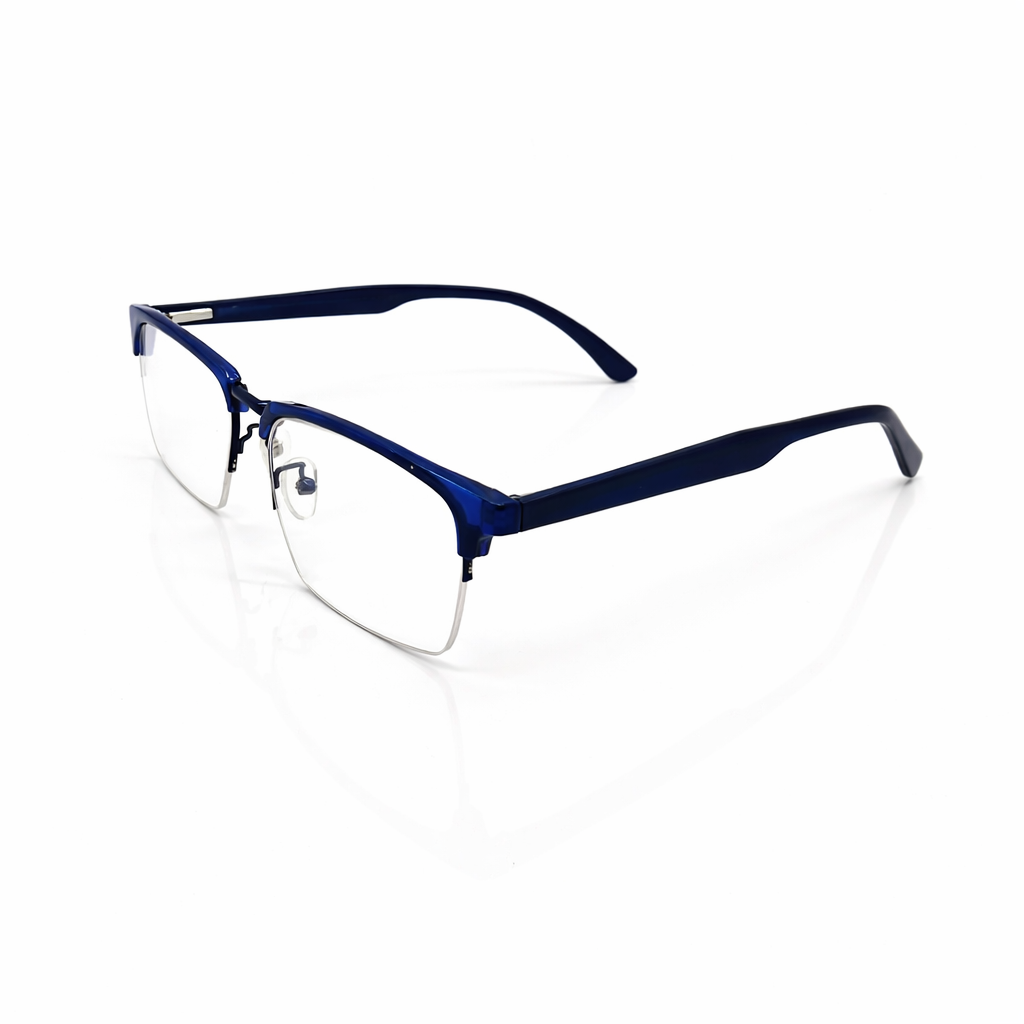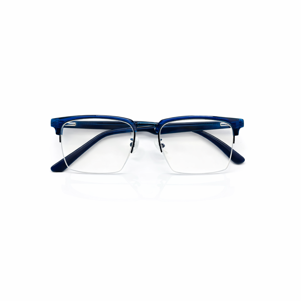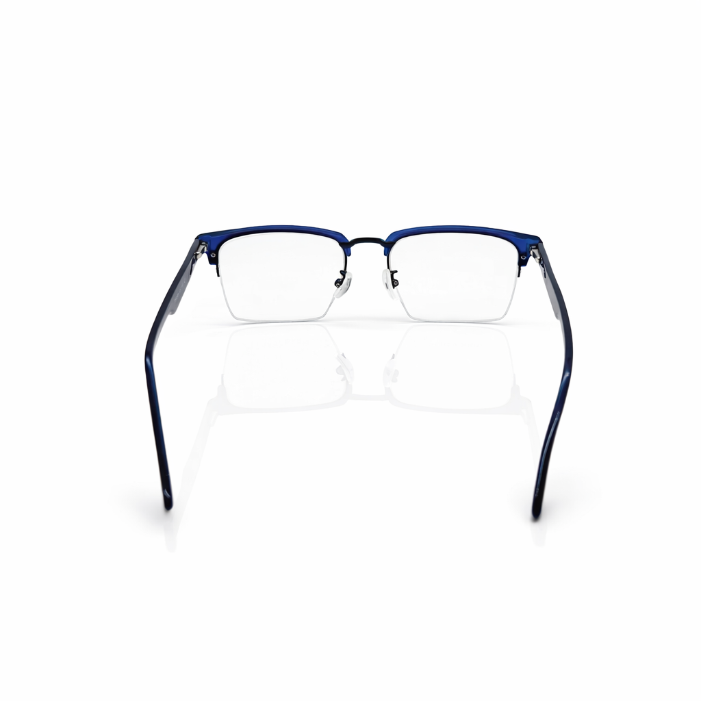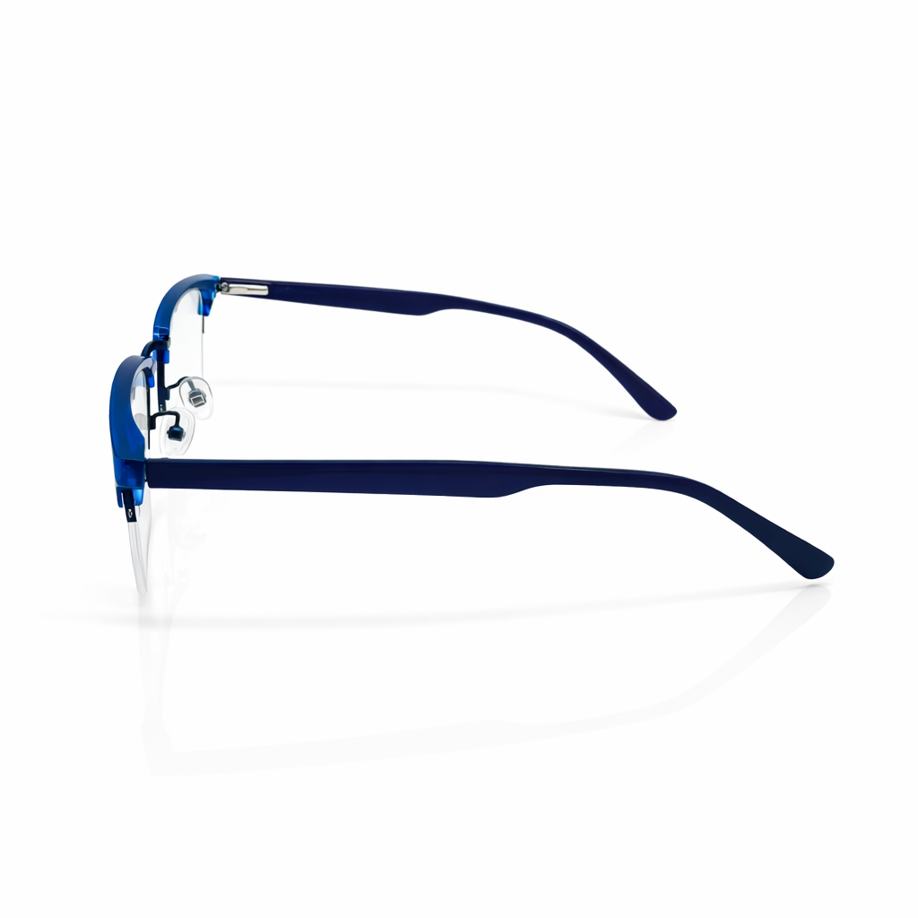 Premium translucent acetate in deep cobalt for a unique, high-fashion pop of color. A slender matte black metal bridge provides structural integrity and a sharp contrast. The semi-rimless design offers a more open, modern aesthetic than traditional full-rim frames. Features adjustable nose pads and contoured temple tips for a secure, custom feel throughout the day.