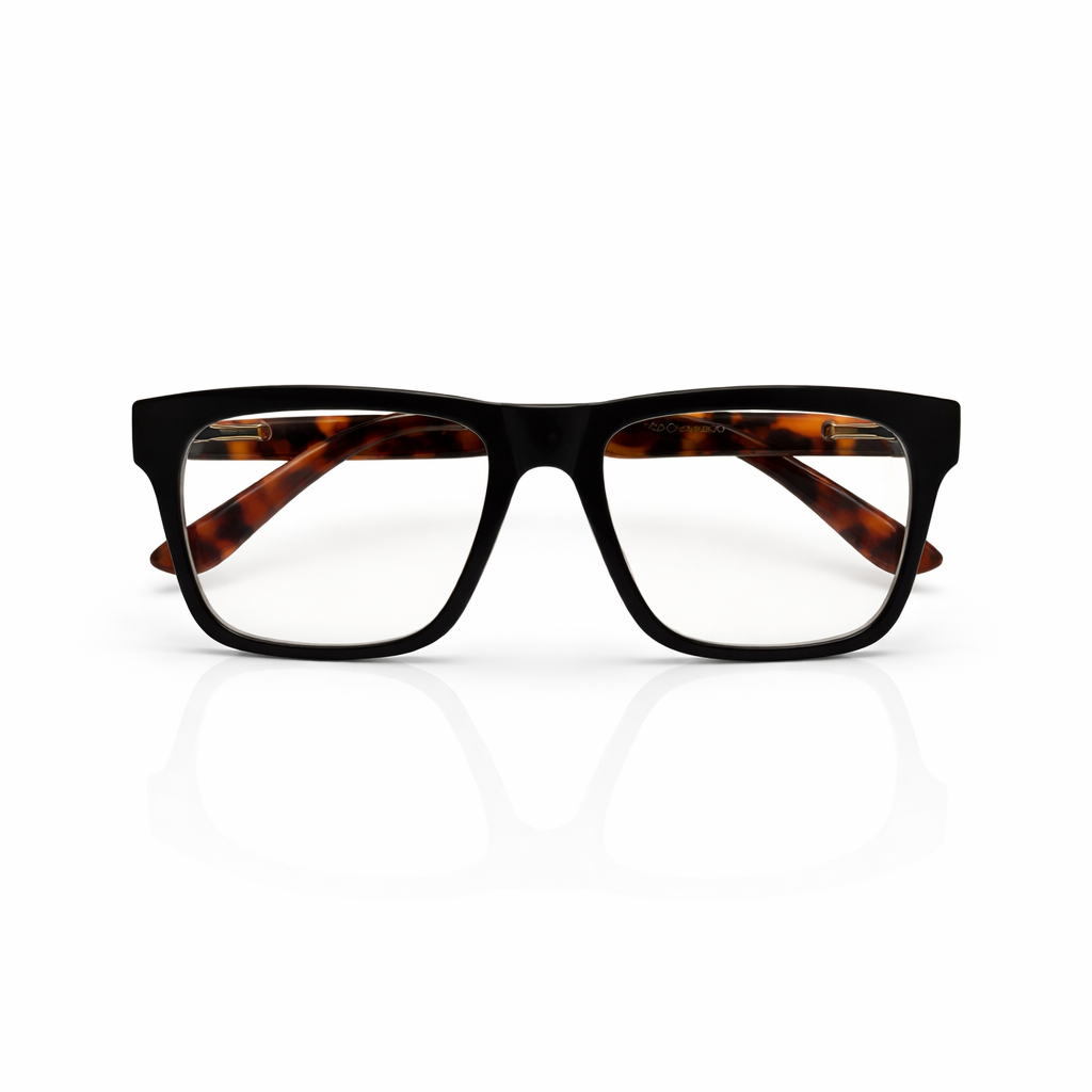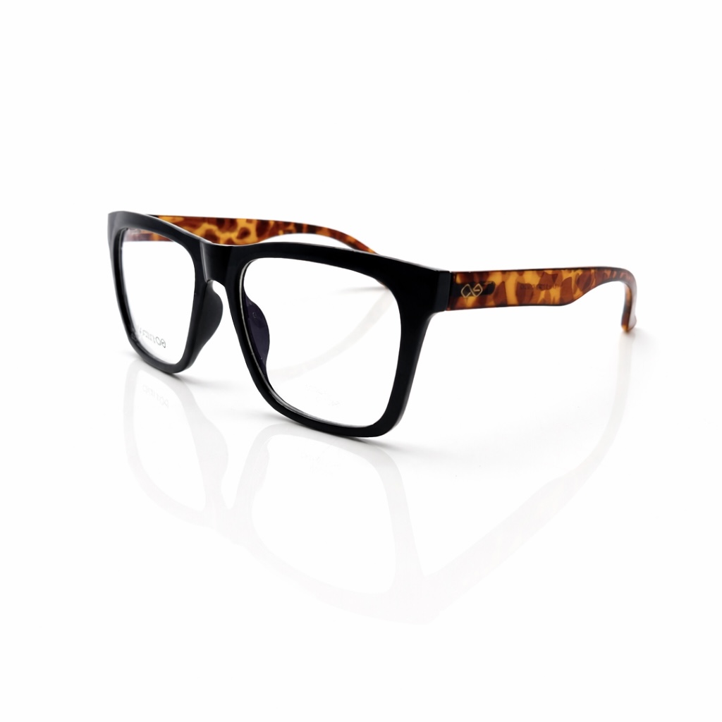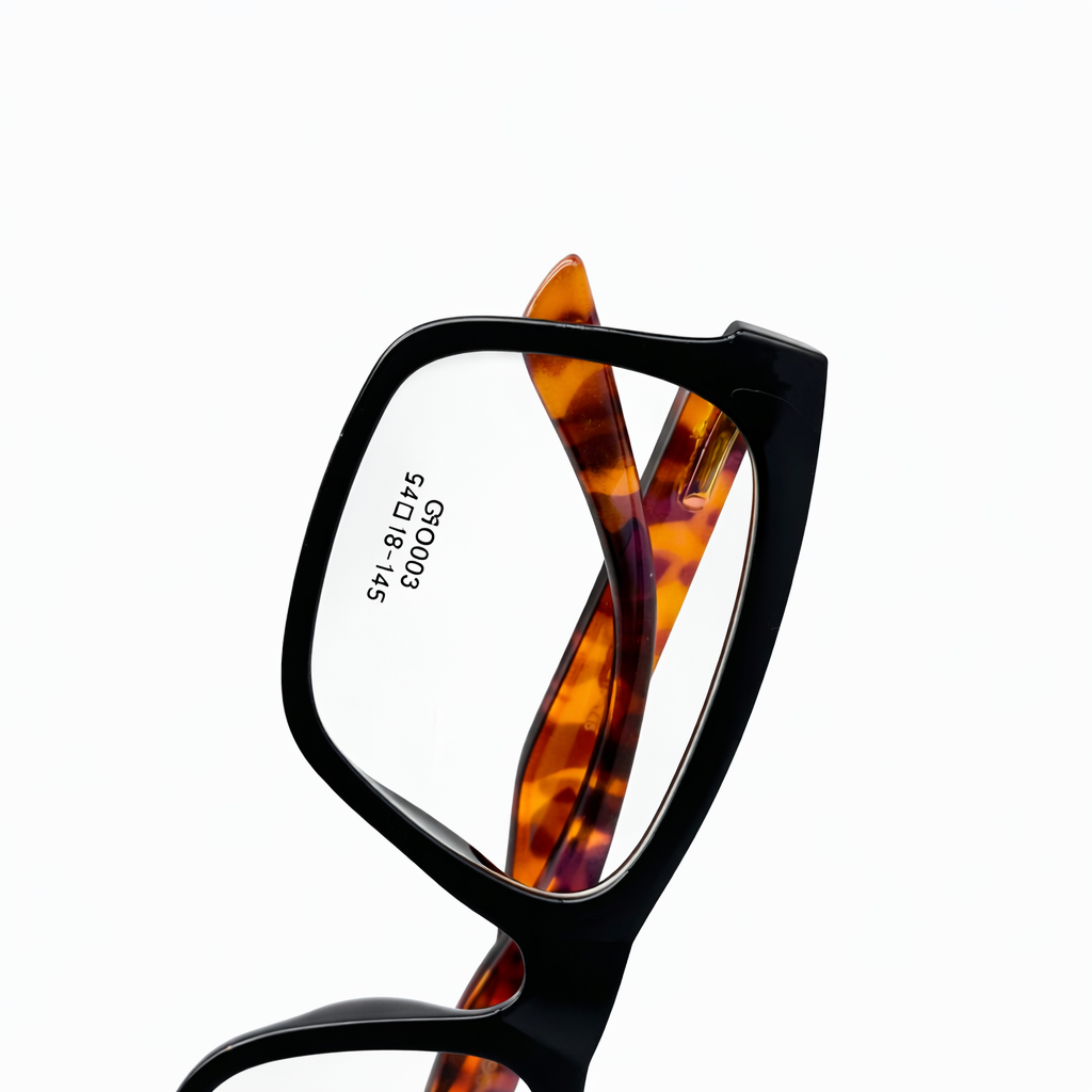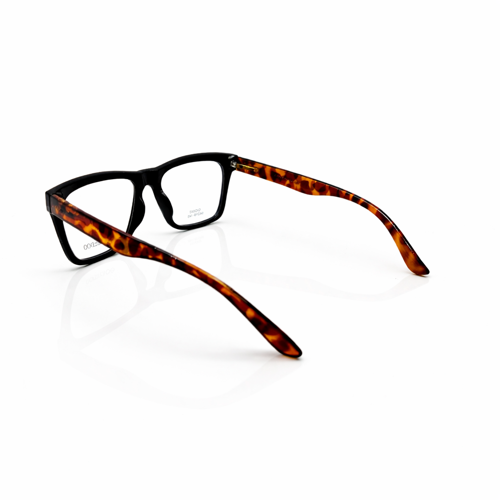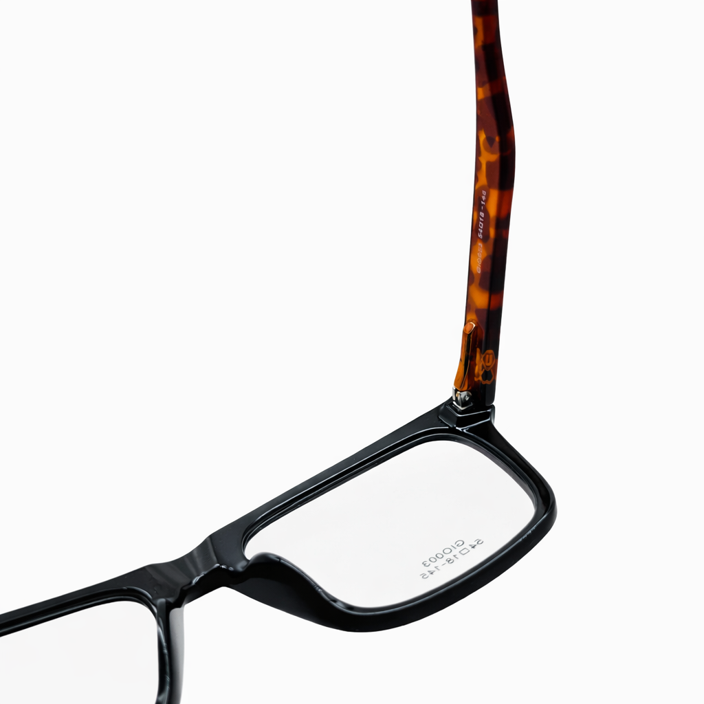 This model features a striking dual-tone colour combination. The front frame is classic matte/gloss black, creating a sleek and minimal appearance, while the temples showcase a warm tortoiseshell pattern in shades of amber and brown. This contrast adds character and depth, giving the frame a stylish and contemporary edge.
