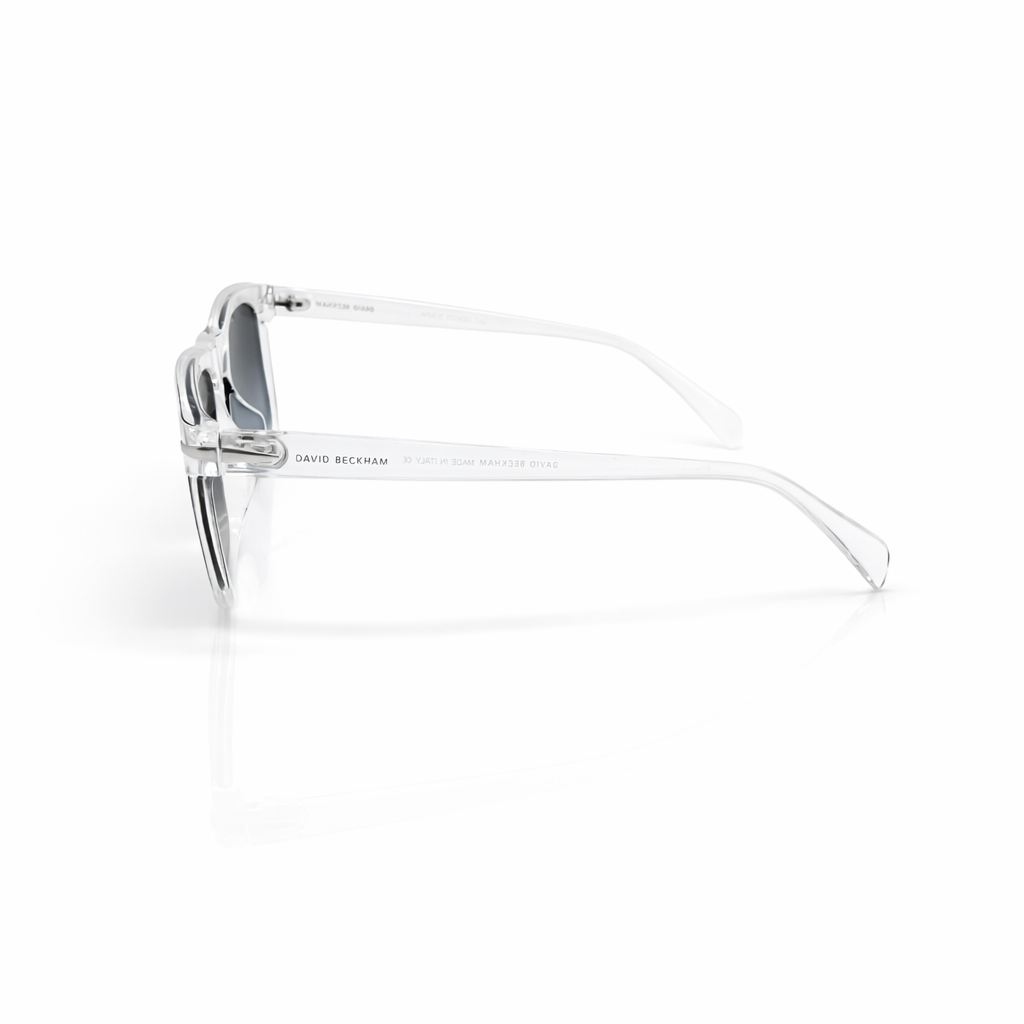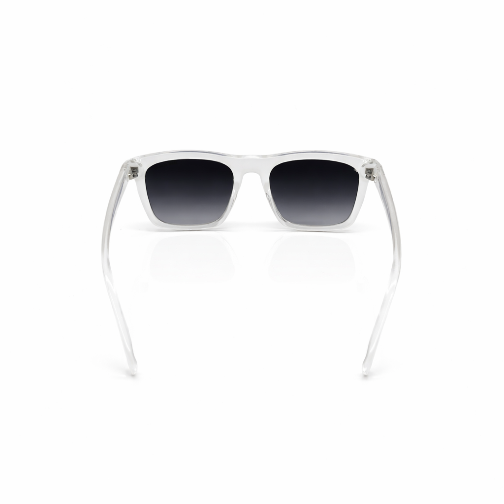 These sunglasses feature a striking crystal-clear acetate frame paired with smoke-grey gradient lenses, creating a look that is both modern and airy. The transparent construction highlights the internal silver-tone hardware, while the squared-off silhouette offers a bold, architectural edge that suits a wide variety of face shapes.