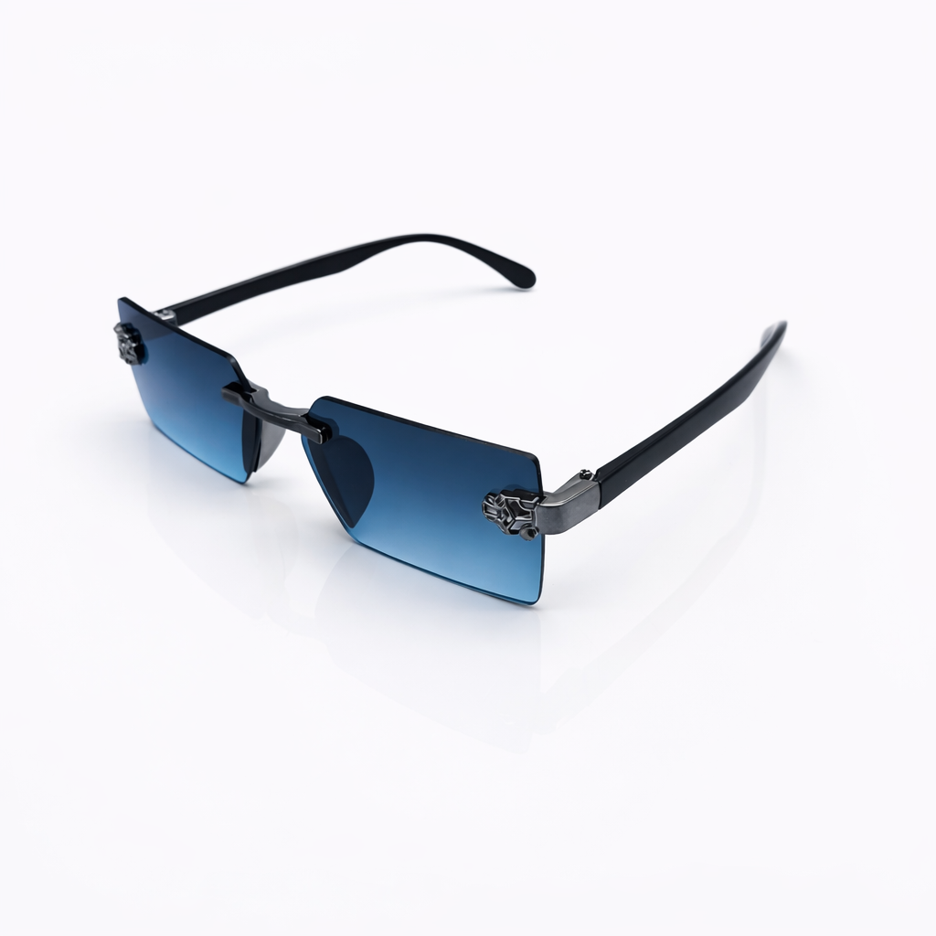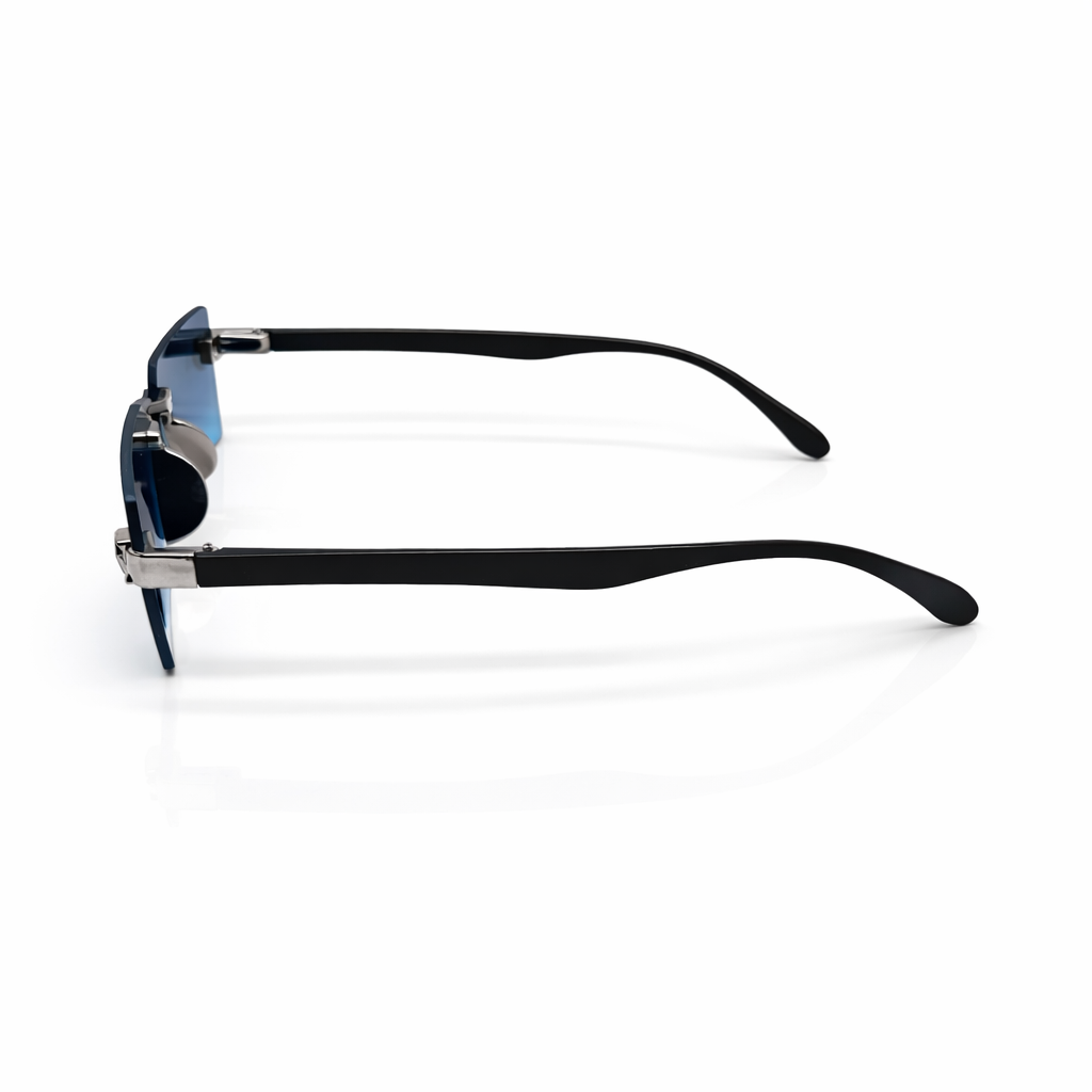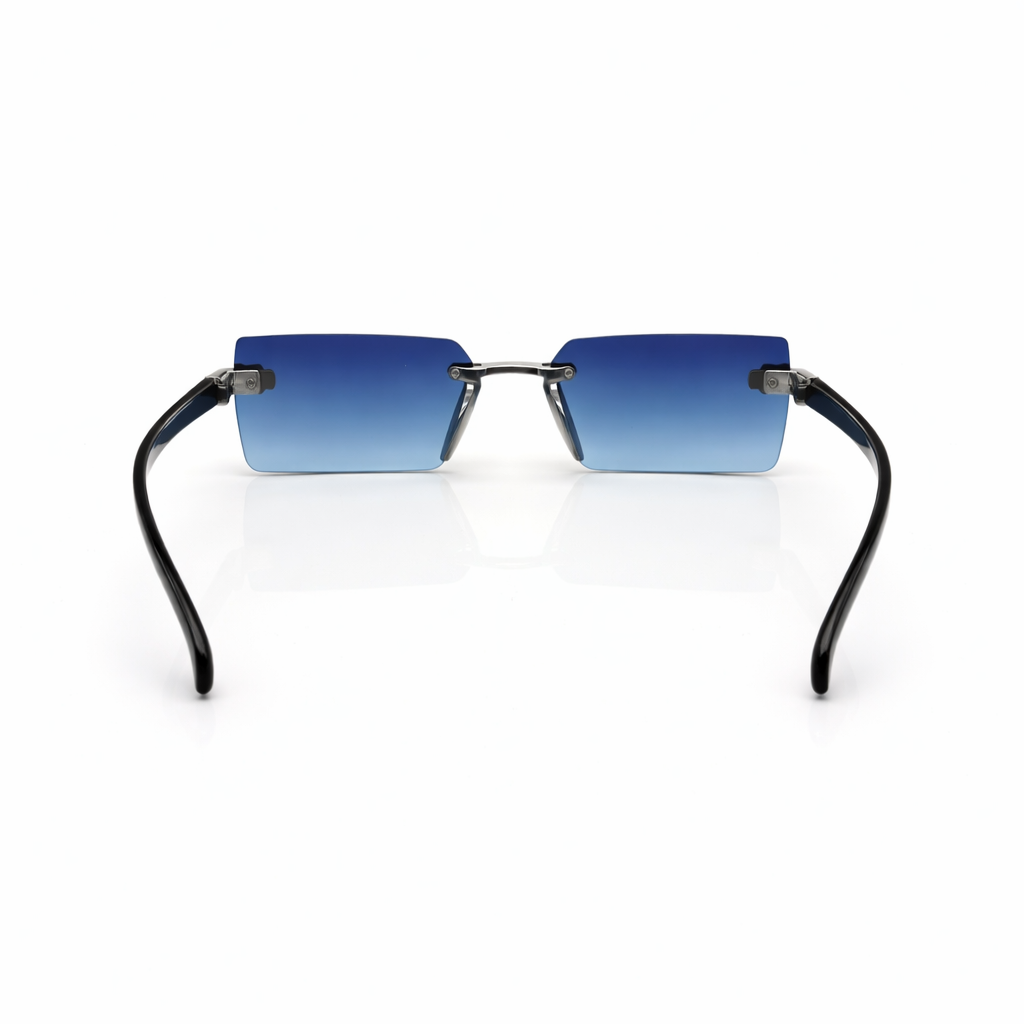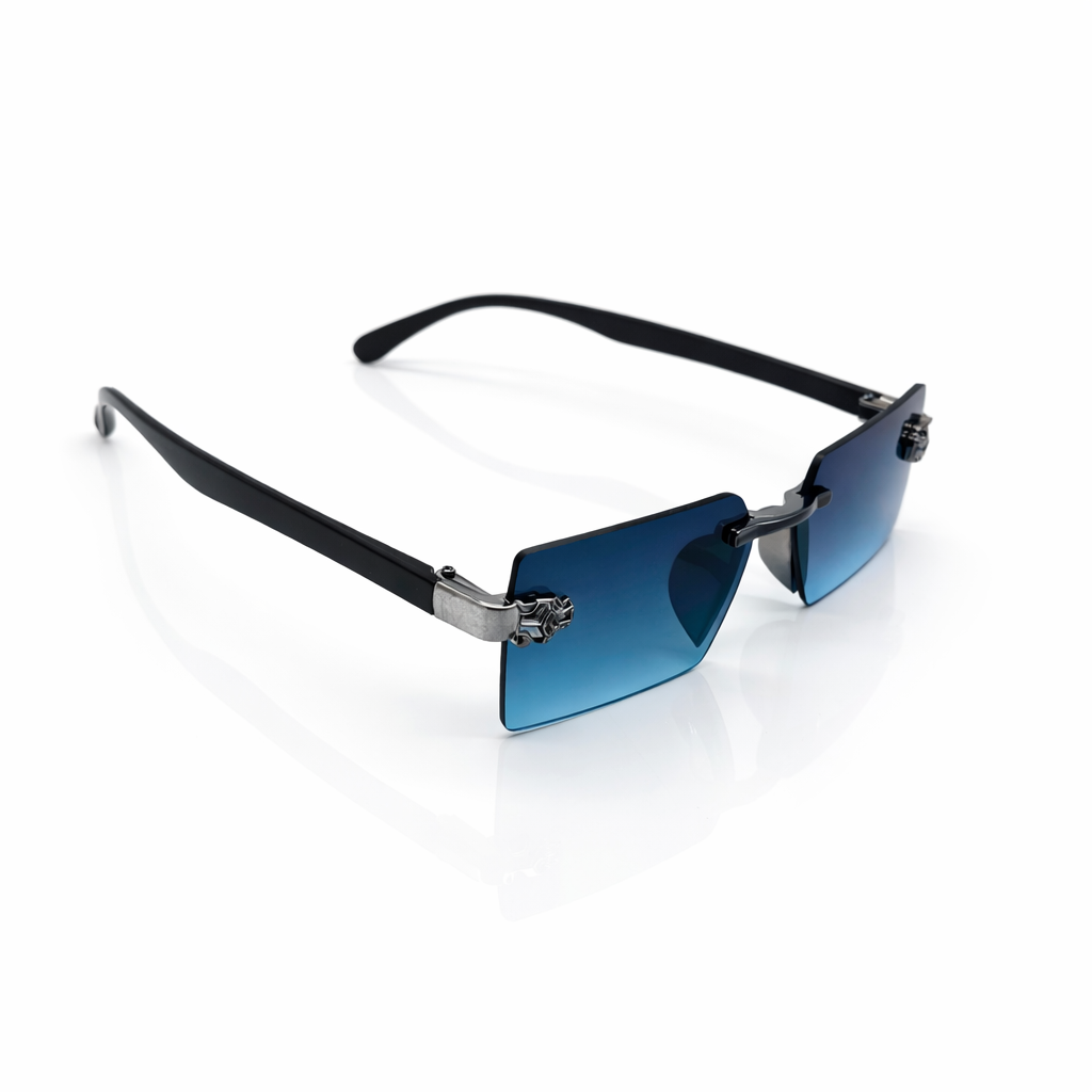Engineered for impact, EyeDoo Nexus Blue blends futuristic design with luxury craftsmanship. Featuring sharp rectangular rimless lenses in a striking cobalt blue gradient, this sunglass is anchored by a sculpted metal bridge and bold geometric side accents that elevate its visual presence. The matte black temples provide balance and comfort, while the lightweight construction ensures effortless wear. Nexus Blue is designed for those who lead with confidence and dress with intent.