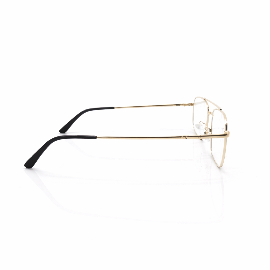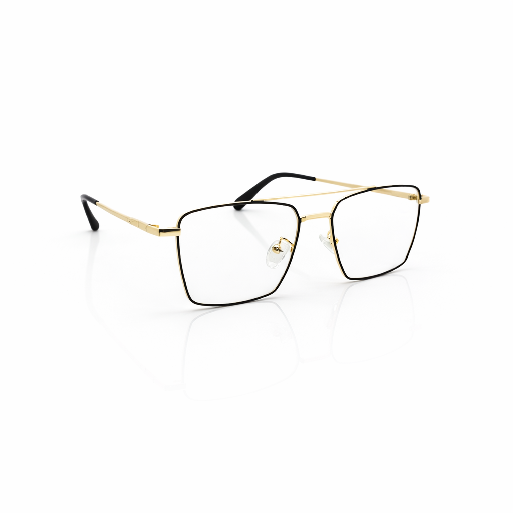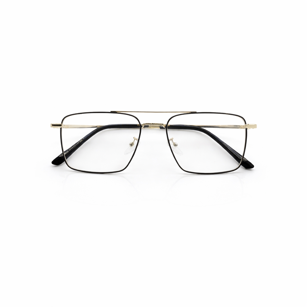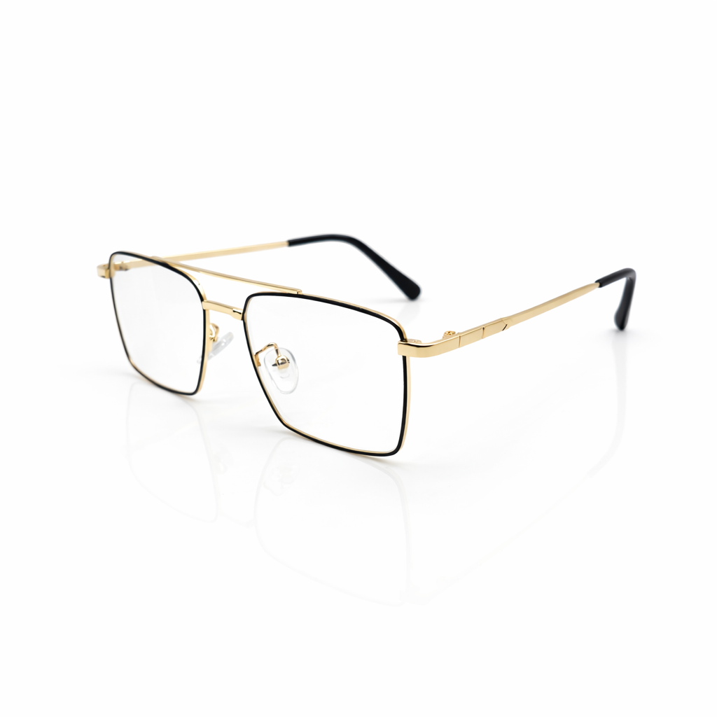 Features a distinctive double bridge (a "brow bar" connecting the top of the lenses), which is a hallmark of navigator and aviator styles. A two-tone finish consisting of polished gold hardware and matte black or dark enamel rims.