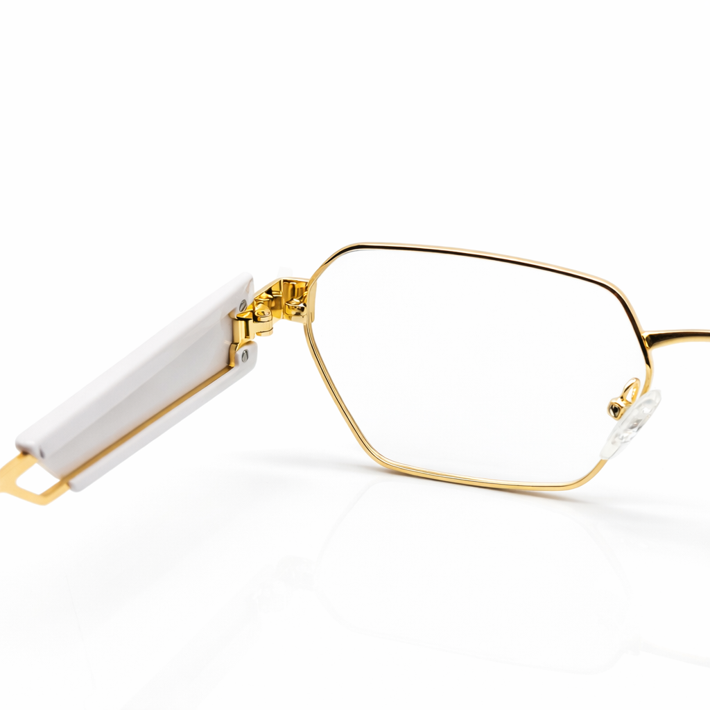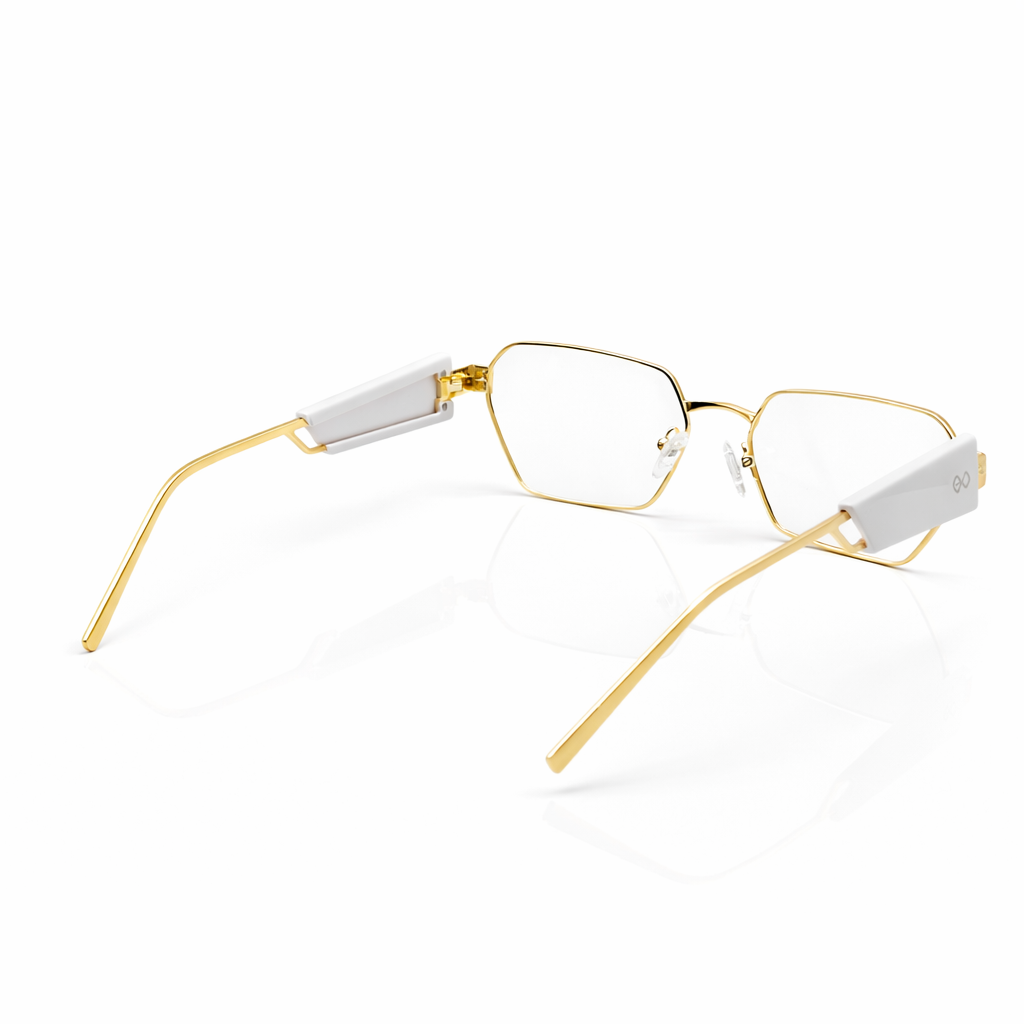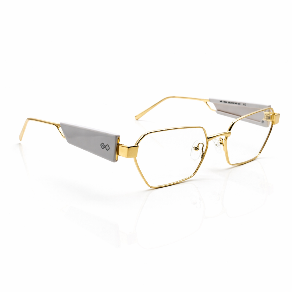 Crafted with a premium gold-tone metal frame, it offers durability while maintaining a lightweight and comfortable feel. The thin metal structure highlights the sharp lens shape, giving the frame a sophisticated and contemporary character. Transparent temple accents add a subtle modern detail, enhancing the overall luxury aesthetic.