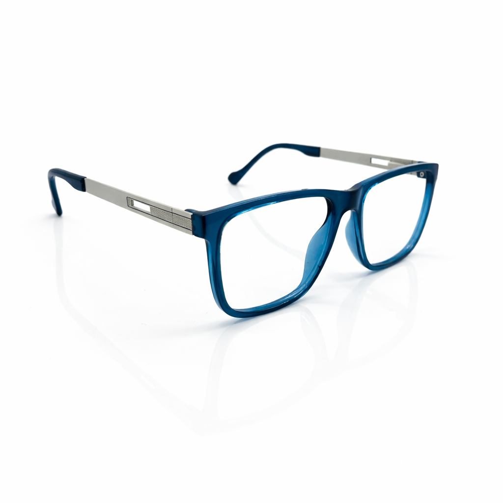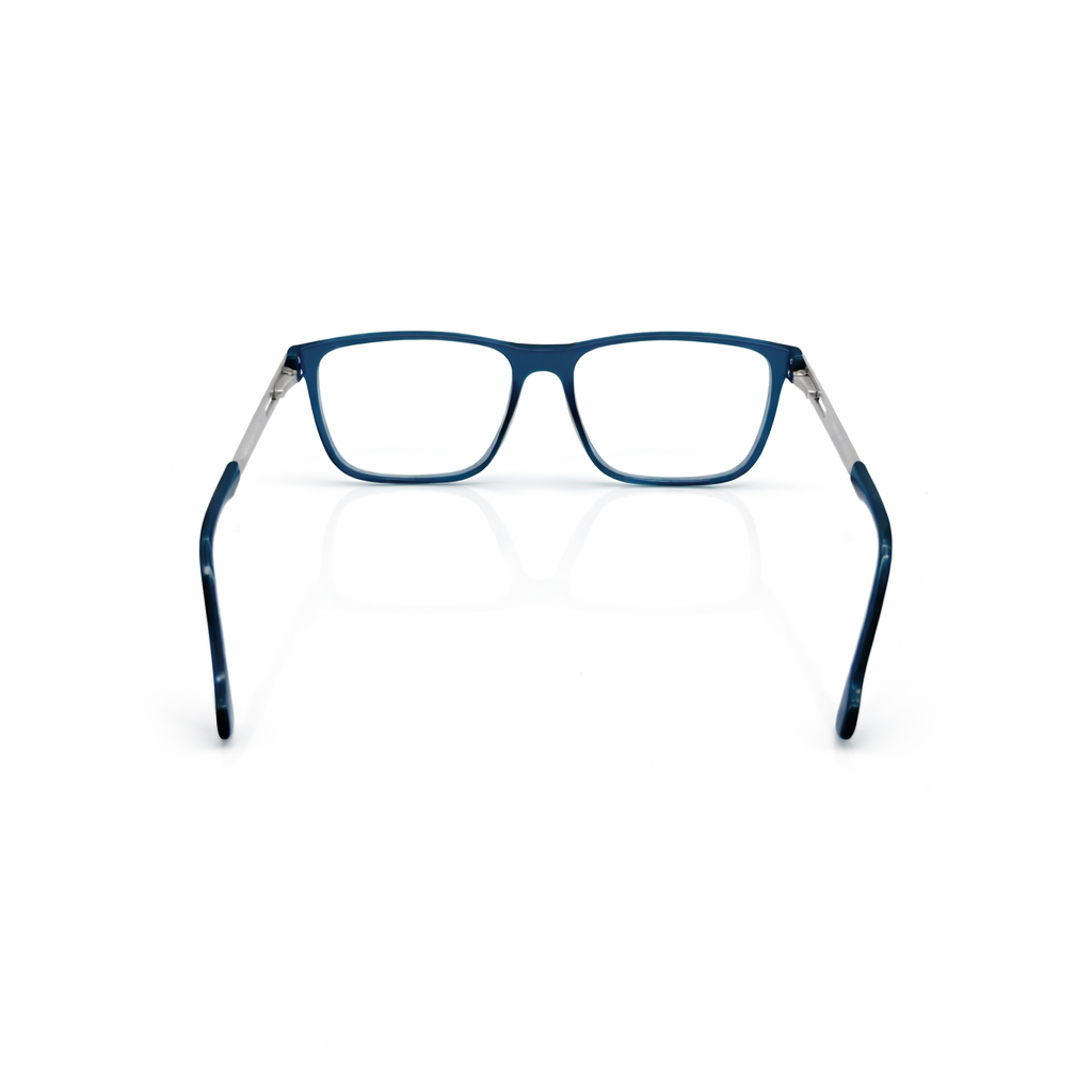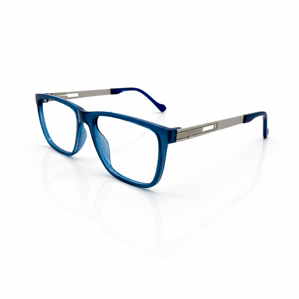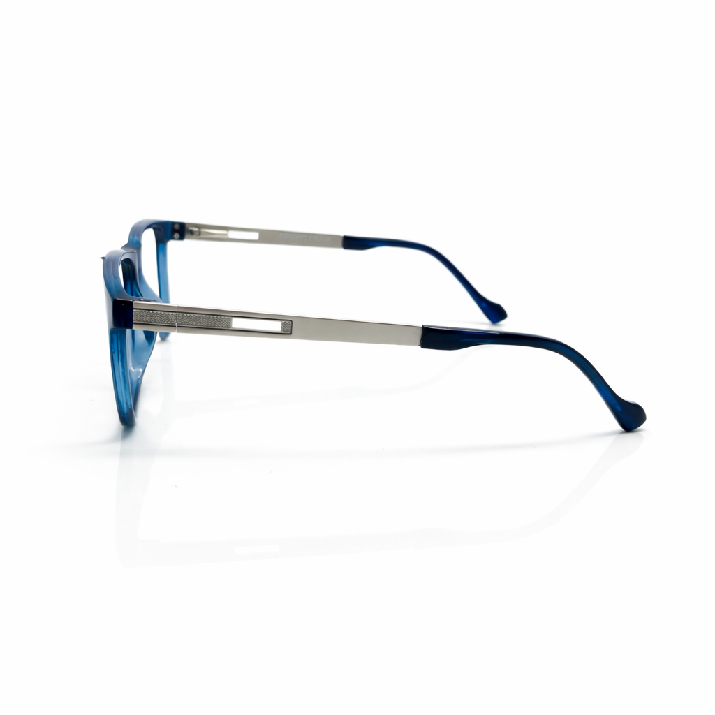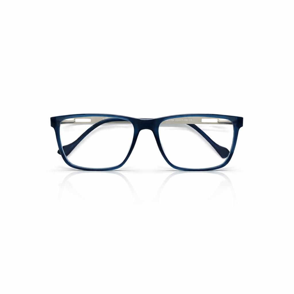 The design features a sharp rectangular silhouette, a shape synonymous with professional confidence and executive style. The frame front is crafted from high-density translucent acetate in a deep sapphire hue. This "Noir" finish is incredibly sophisticated—it provides the grounding presence of a black frame but with a layer of depth and color that adds intrigue to your look.