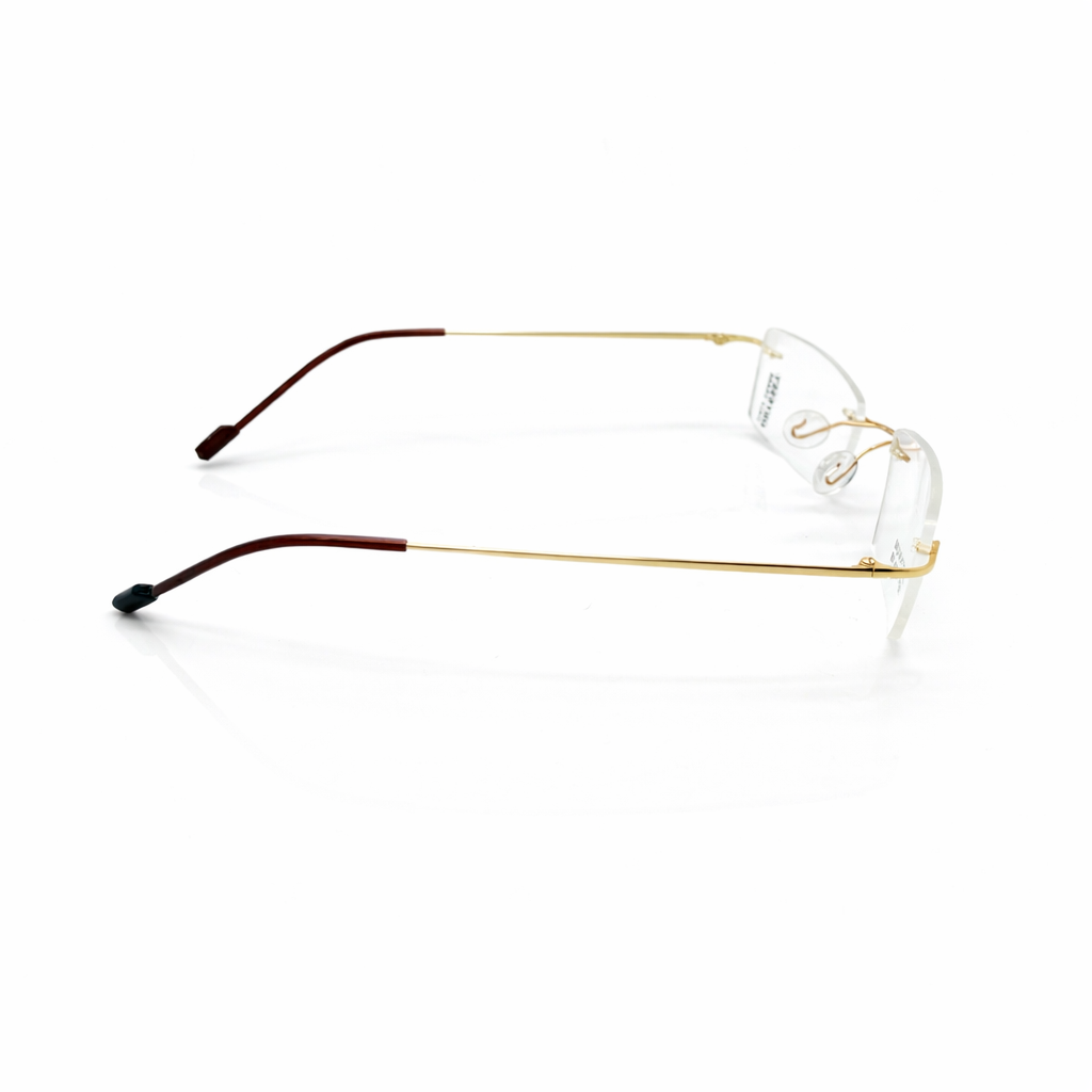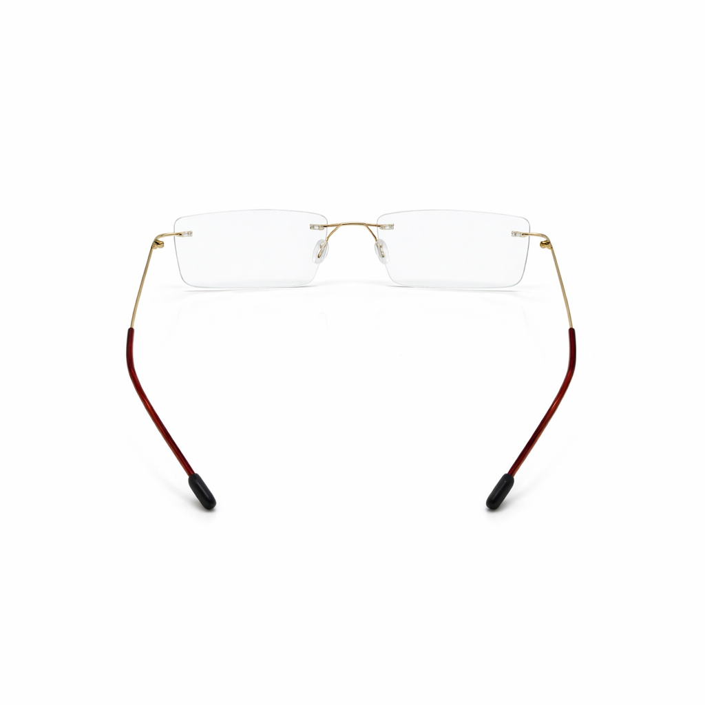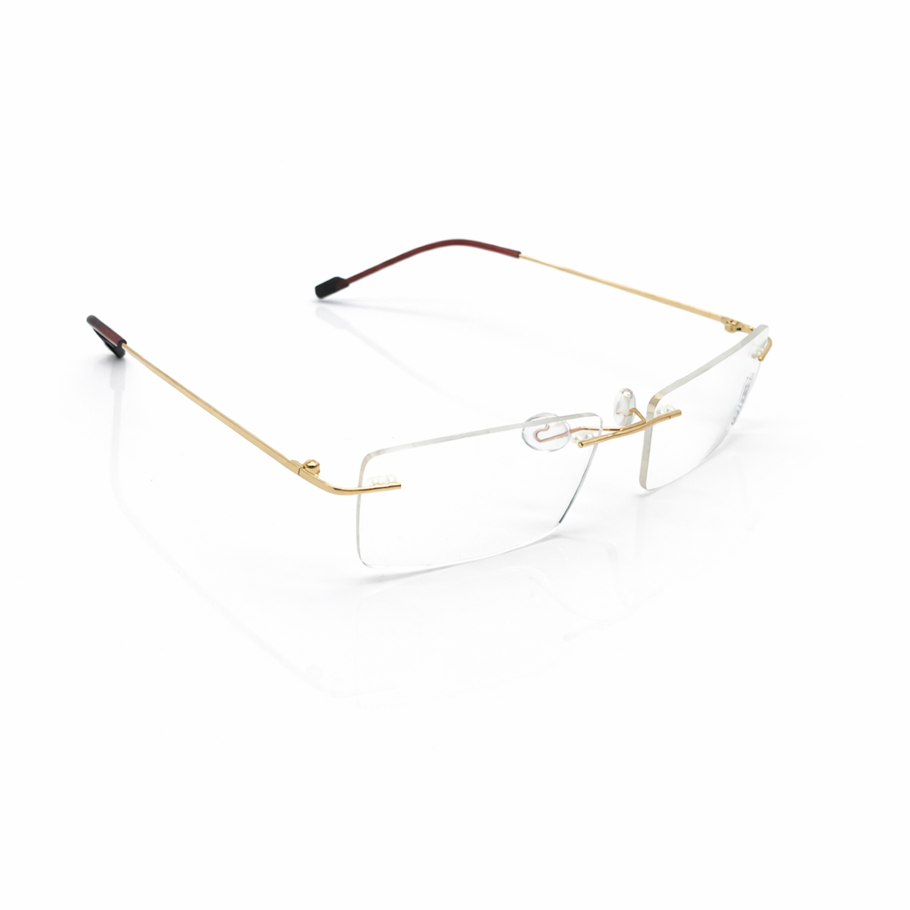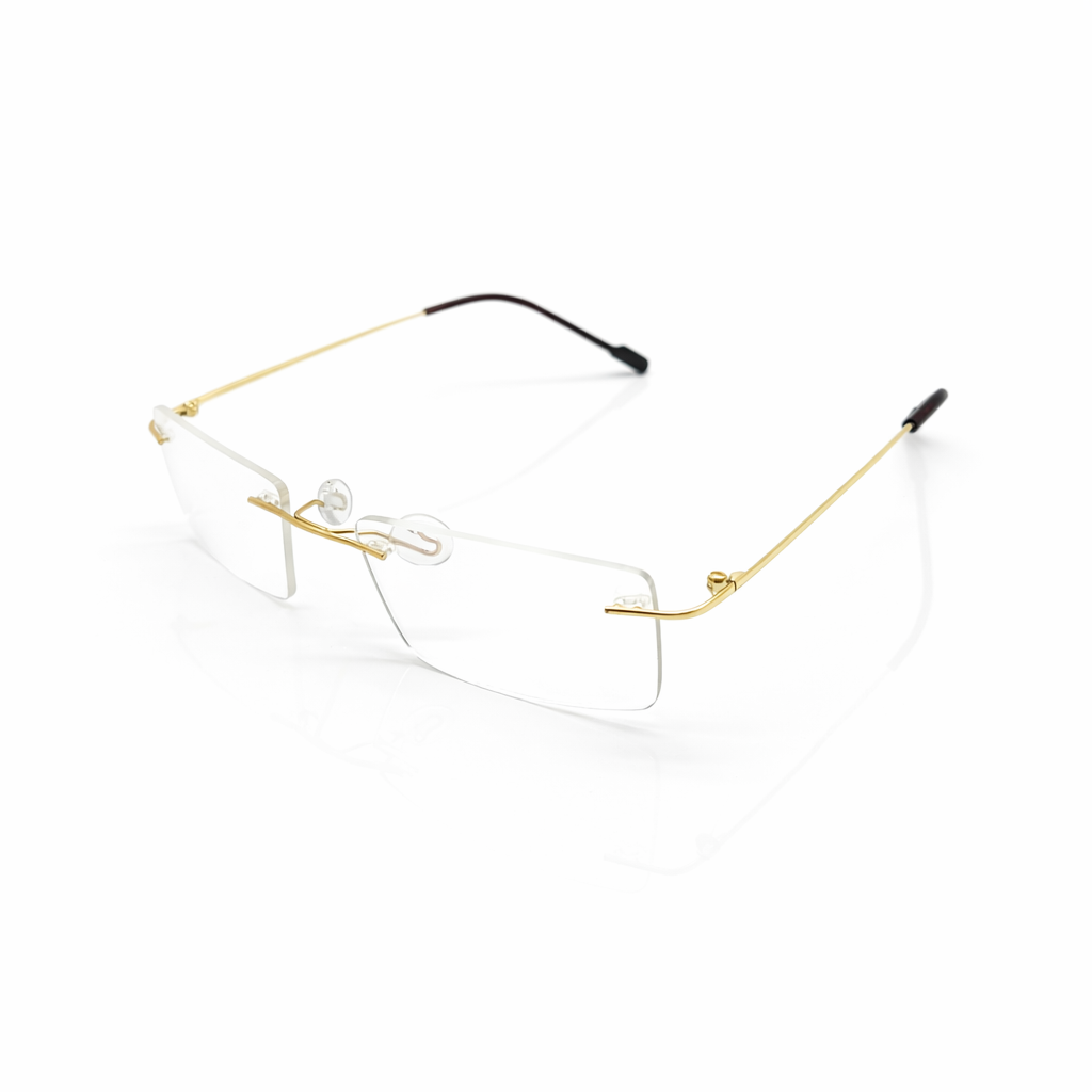 Highlights the premium gold finish and the clarity of the rimless design. A sophisticated name using the Latin word for gold, perfect for a high-end collection. Emphasizing the classic rectangular shape with a luxury metallic twist.