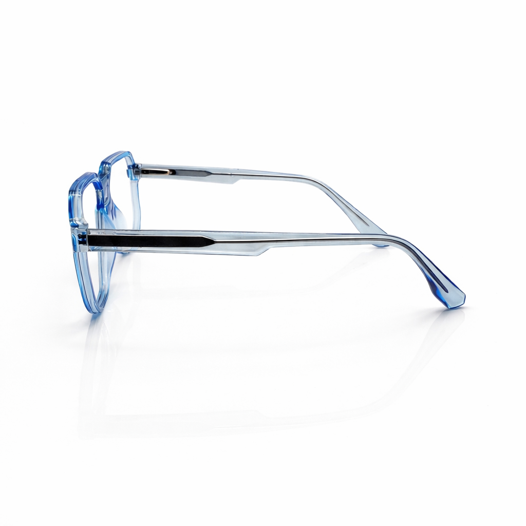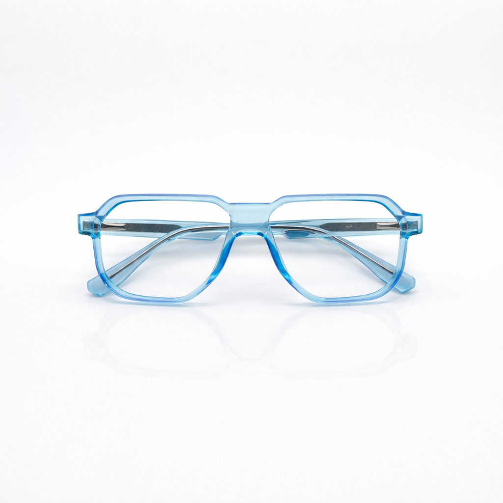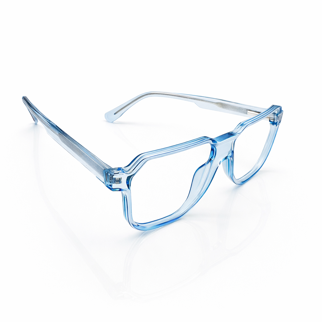 The design is defined by its confident flat-top geometric silhouette, merging a strong architectural brow line with deep, squared-off lenses. The frame is sculpted from premium matte translucent acetate in a cool, smoky grey. This "Glacier Mist" finish diffuses light like fog over ice, creating a soft, sophisticated texture that is smooth to the touch and resists fingerprints.