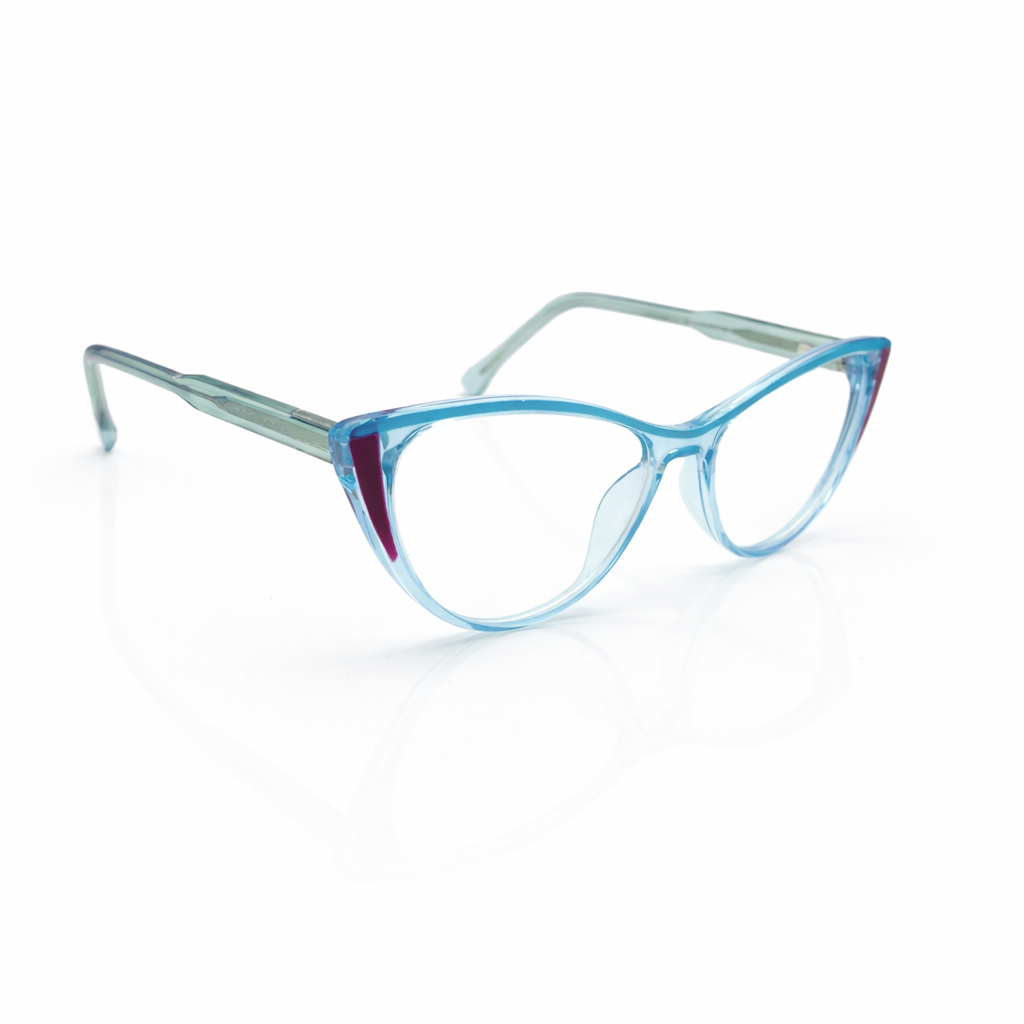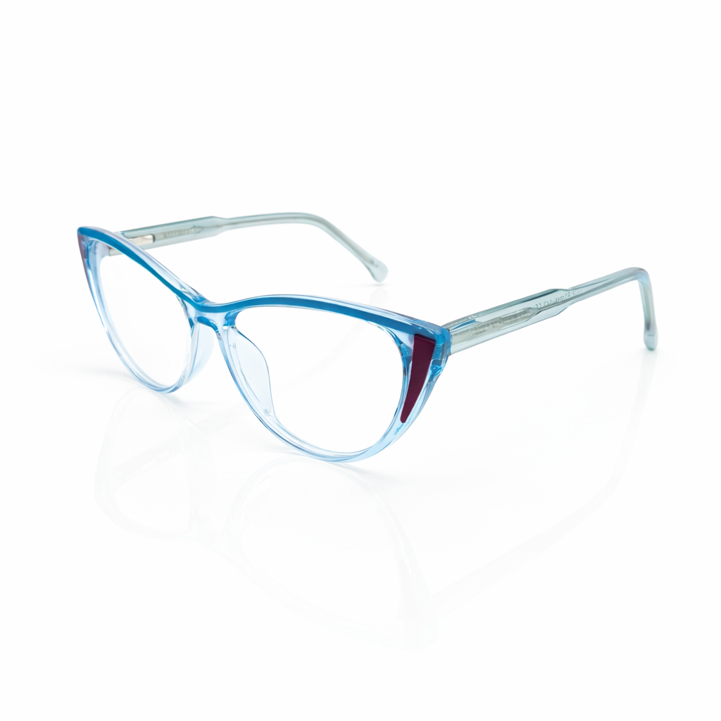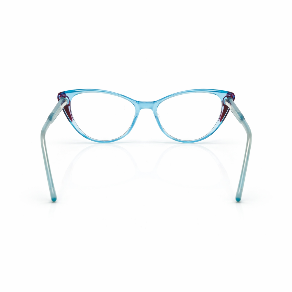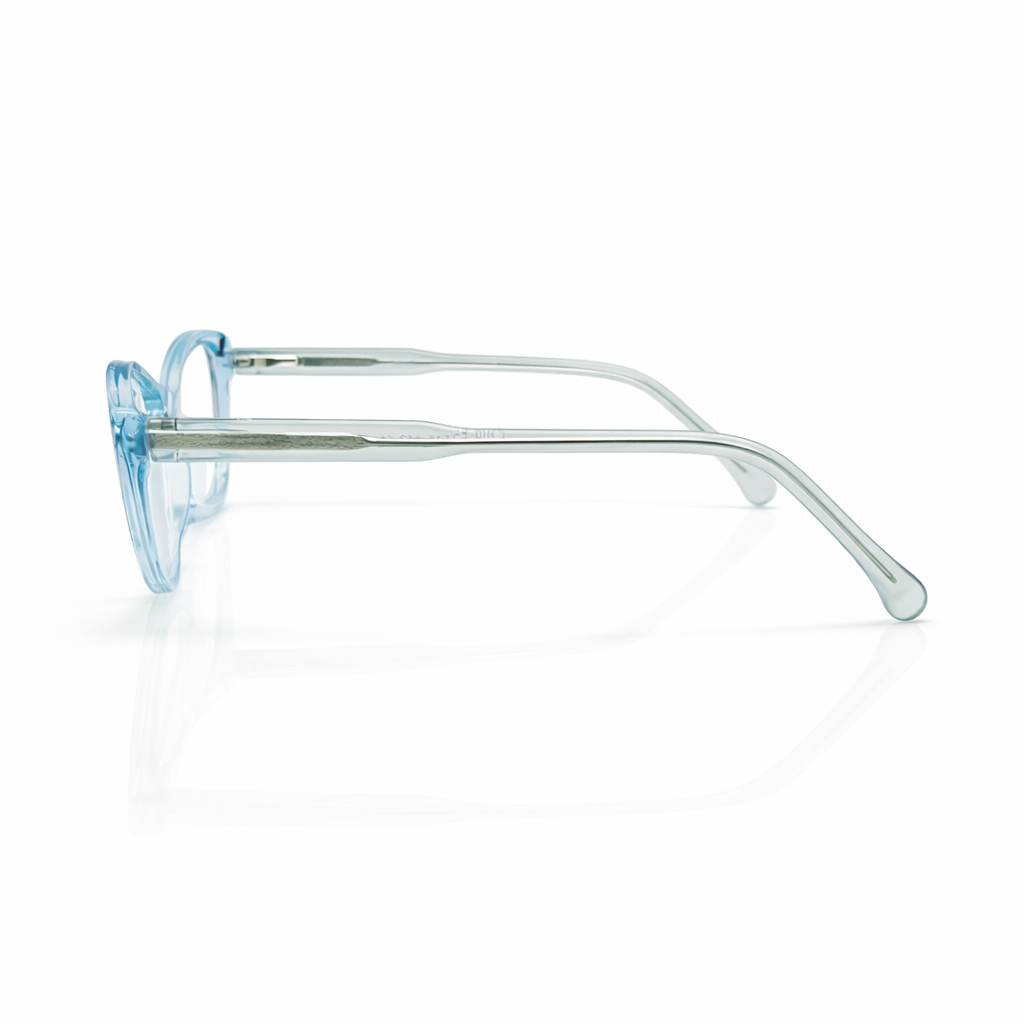 The silhouette is a confident soft geometric square, featuring a bold brow line that gently curves into rounded corners for a flattering, feminine lift. The colorway is a stunning "Azure Fade" (Ombre): the frame begins in a deep, mysterious azure-navy at the top and dissolves seamlessly into crystal clear at the bottom, creating a light and airy look on the face.