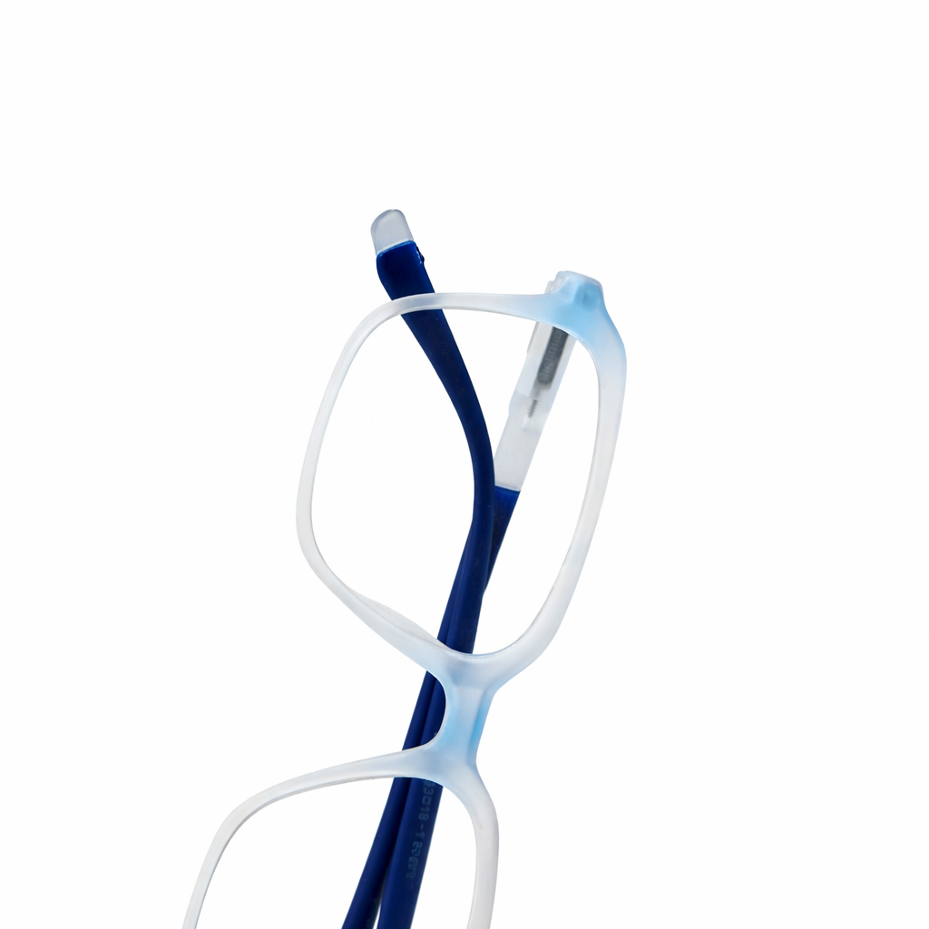 Crafted for both men and women, the Orion frame features a lightweight full-rim design that ensures durability without compromising comfort. The subtle transition from clear to soft blue around the frame enhances its modern appeal while keeping the look clean and minimal. Square optical frames are widely chosen for their timeless and professional style, suitable for both casual and formal settings.
